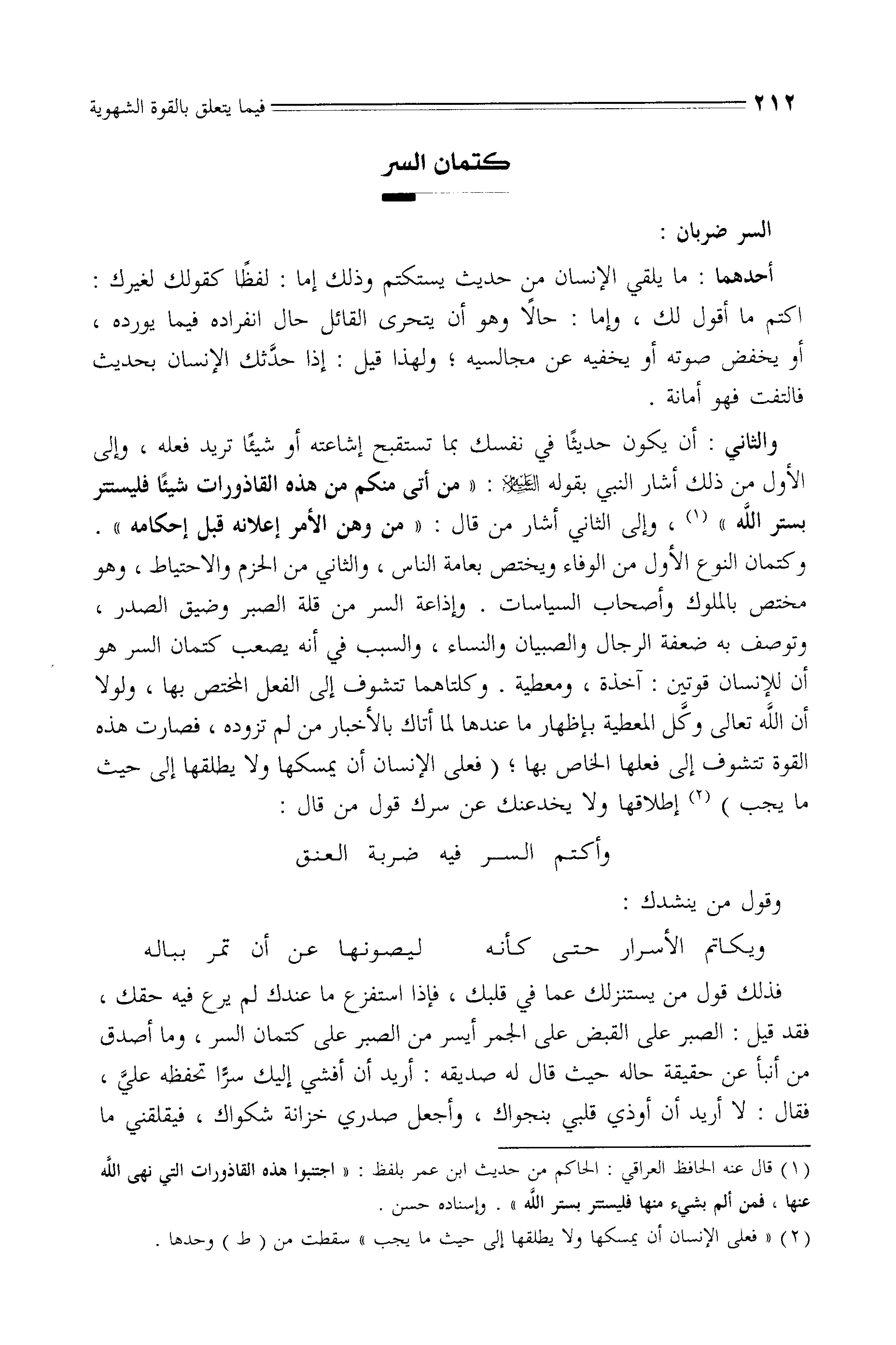والثاني: أن يكون حديثًا في نفسك بما تستقبح إشاعته أو شيئًا تريد فعله، وإلى الأول من ذلك أشار النبي بقوله - صلى الله عليه وسلم -: " من أتى منكم من هذه القاذورات شيئًا فليستتر بستر اللَّه "، وإلى الثاني أشار من قال: " من وهن الأمر إعلانه قبل إحكامه ".