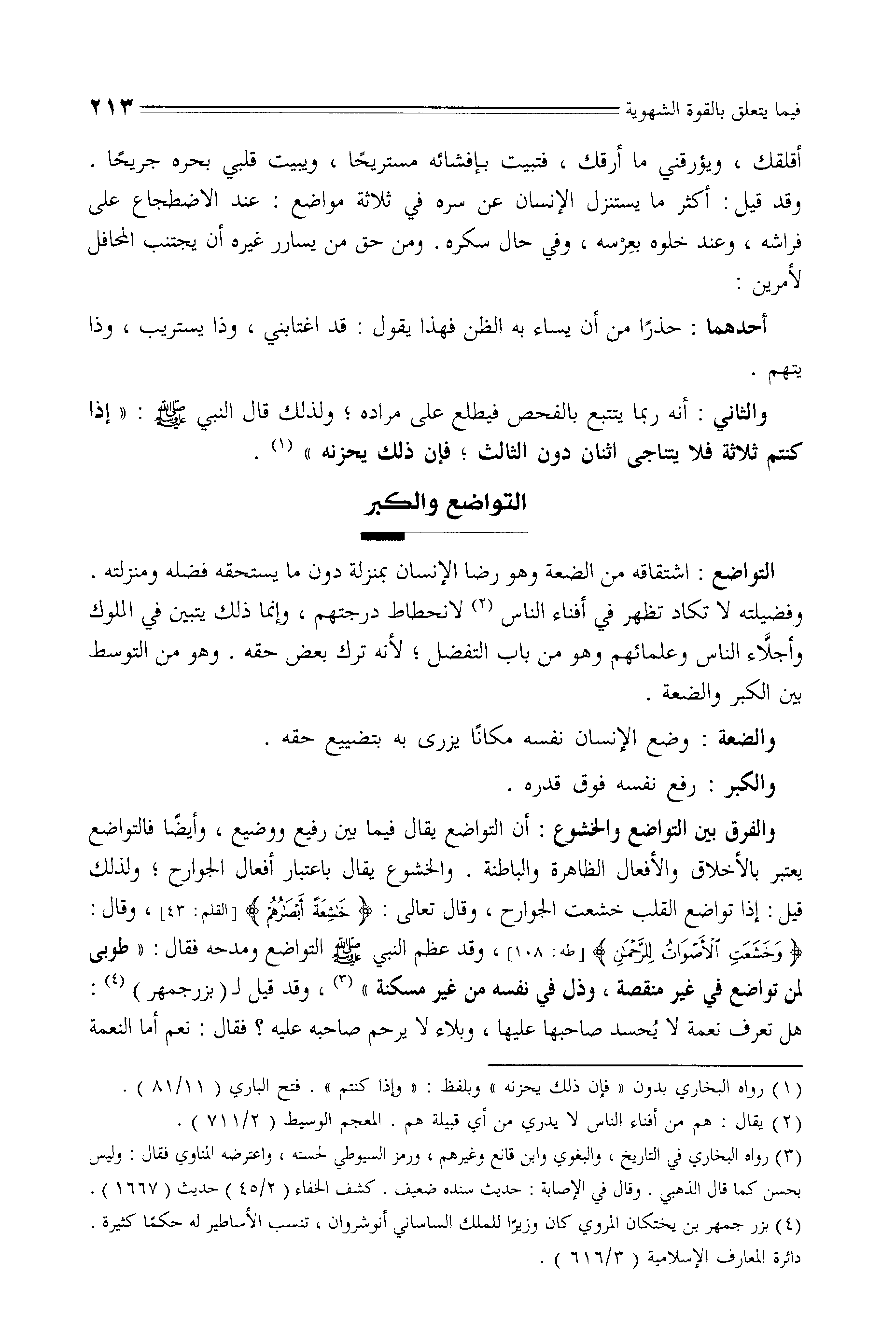 والثاني: أنه ربما يتتبع بالفحص فيطلع على مراده، ولذلك قال - صلى الله عليه وسلم -: " إذا كنتم ثلاثة فلا يتناجى اثنان دون الثالث، فإن ذلك يحزنه ".