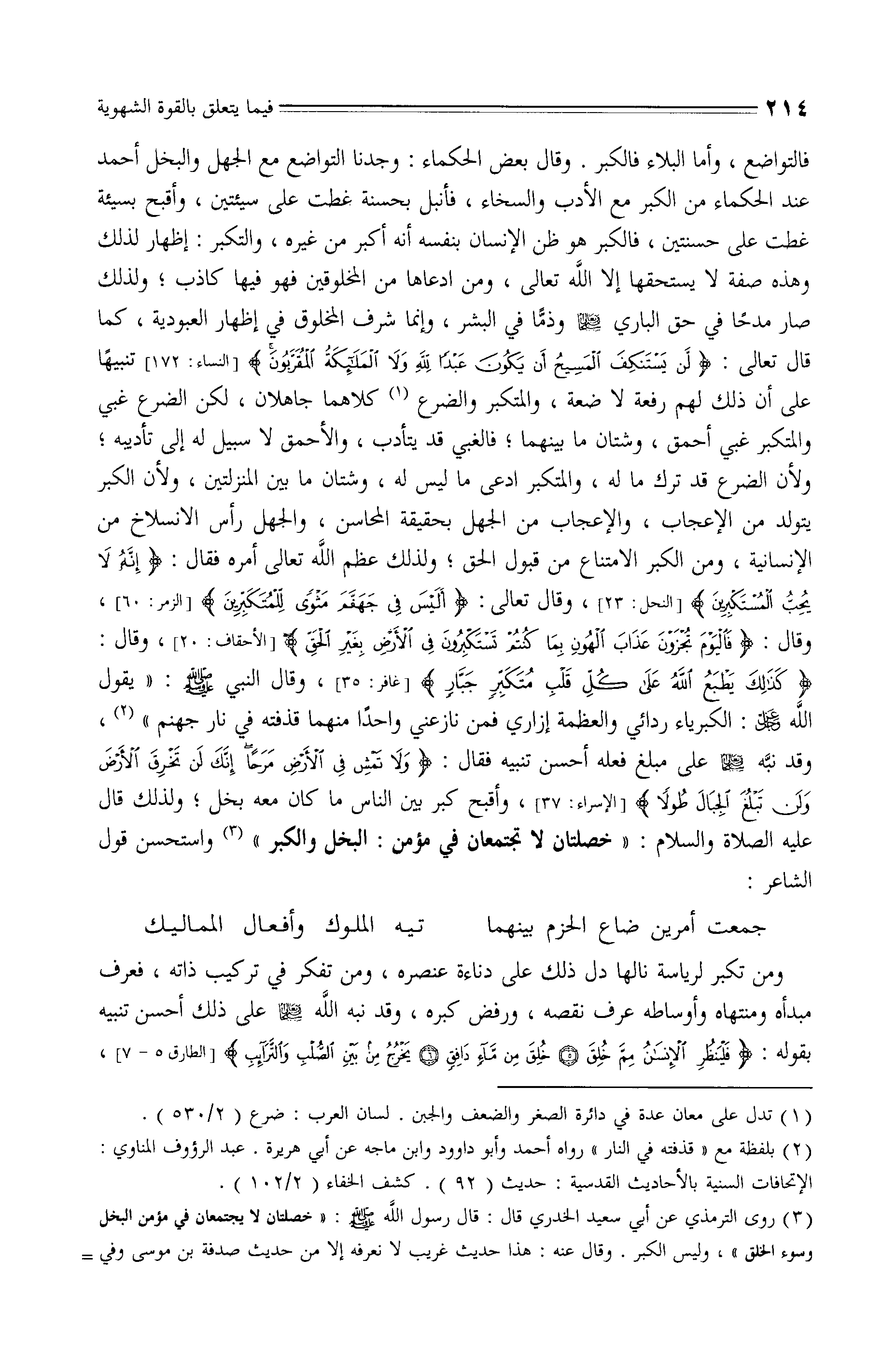 عليه الصلاة والسلام: " خصلتان لا تجتمعان في مؤمن: البخل والكبر " واستحسن قول الشاعر:
