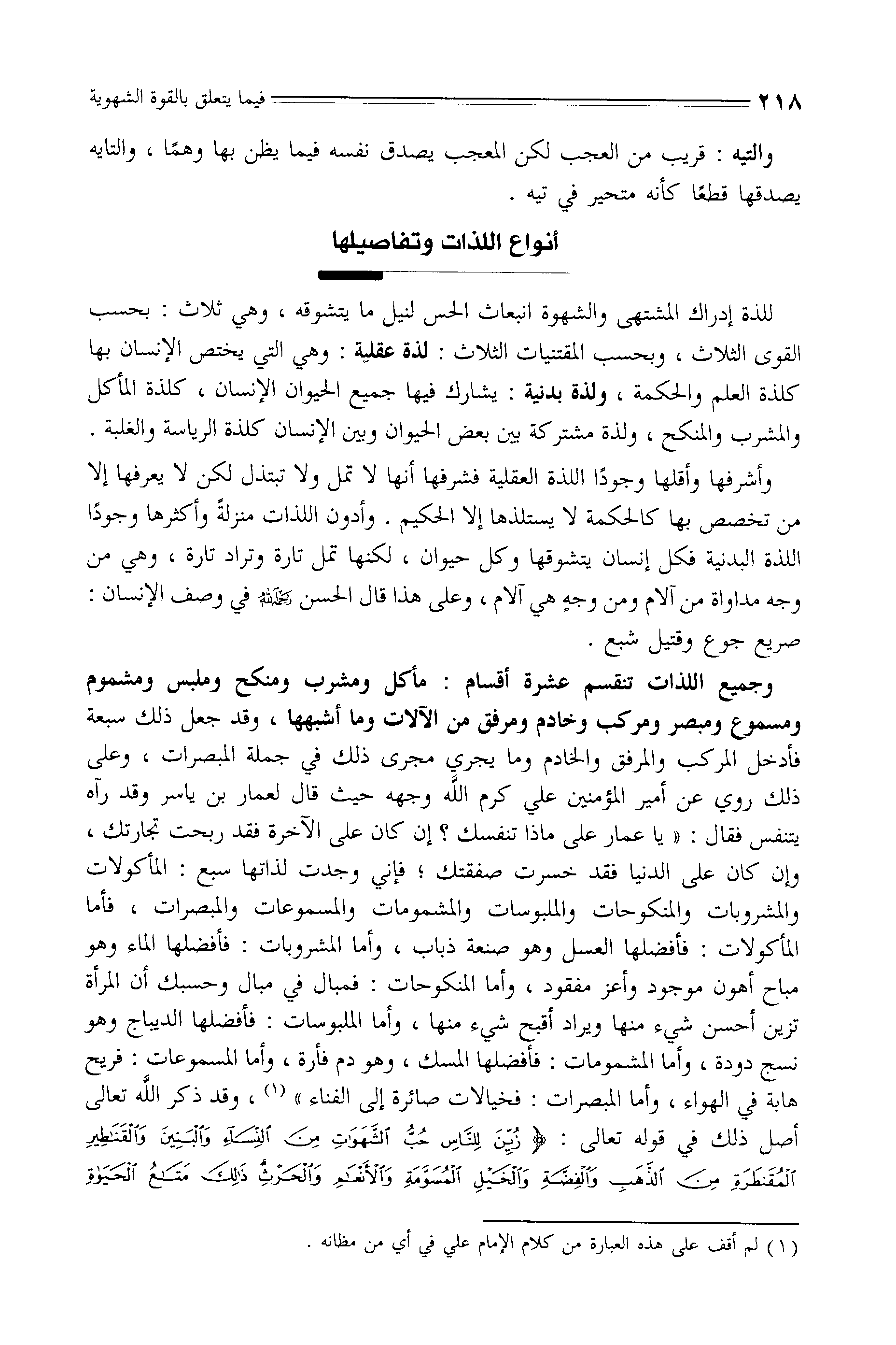 ومسموع ومبصر ومركب وخادم ومرفق من الآلات وما أشبهها، وقد جعل ذلك سبعة فأدخل المركب والمرفق والخادم وما يجري مجرى ذلك في جملة المبصرات، وعلى ذلك روي عن أمير المؤمنين علي كرم الله وجهه حيث قال لعمار بن ياسر وقد رآه يتنفس فقال: " يا عمار على ماذا تنفسك، إن كان على الآخرة فقد ربحت تجارتك، وإن كان على الدنيا فقد خسرت صفقتك، فإني وجدت لذاتها سبع: المأكولات والمشرويات والمنكوحات والملبوسات والمشمومات والمسموعات والمبصرات،