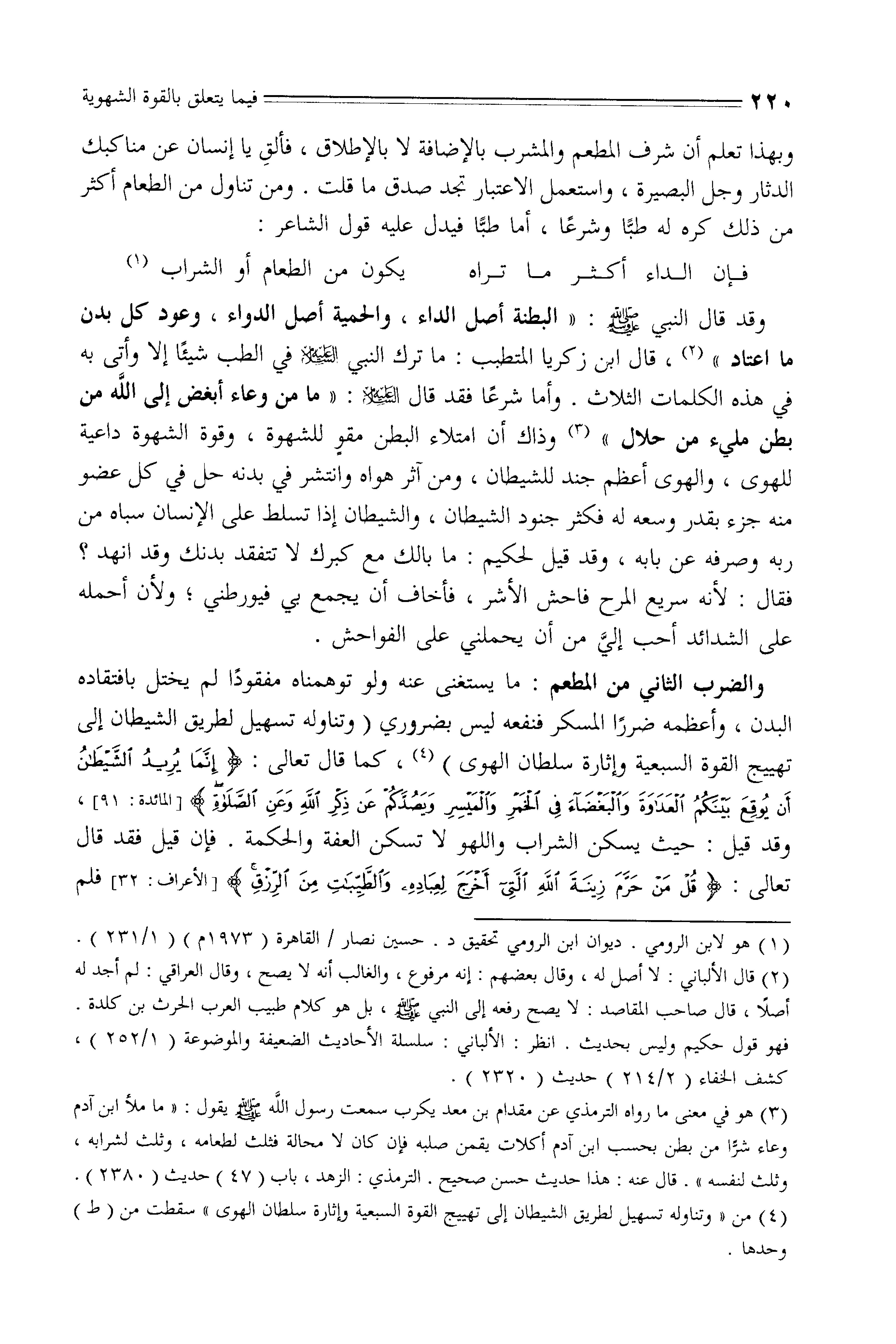 وبهذا تعلم أن شرف المطعم والمشرب بالإضافة لا بالإطلاق، فألقِ يا إنسان عن مناكبك الدثار وجل البصيرة، واستعمل الاعتبار تجد صدق ما قلت. ومن تناول من الطعام أكثر من ذلك كره له طبا وشرعًا، أما طبًّا فيدل عليه قول الشاعر: