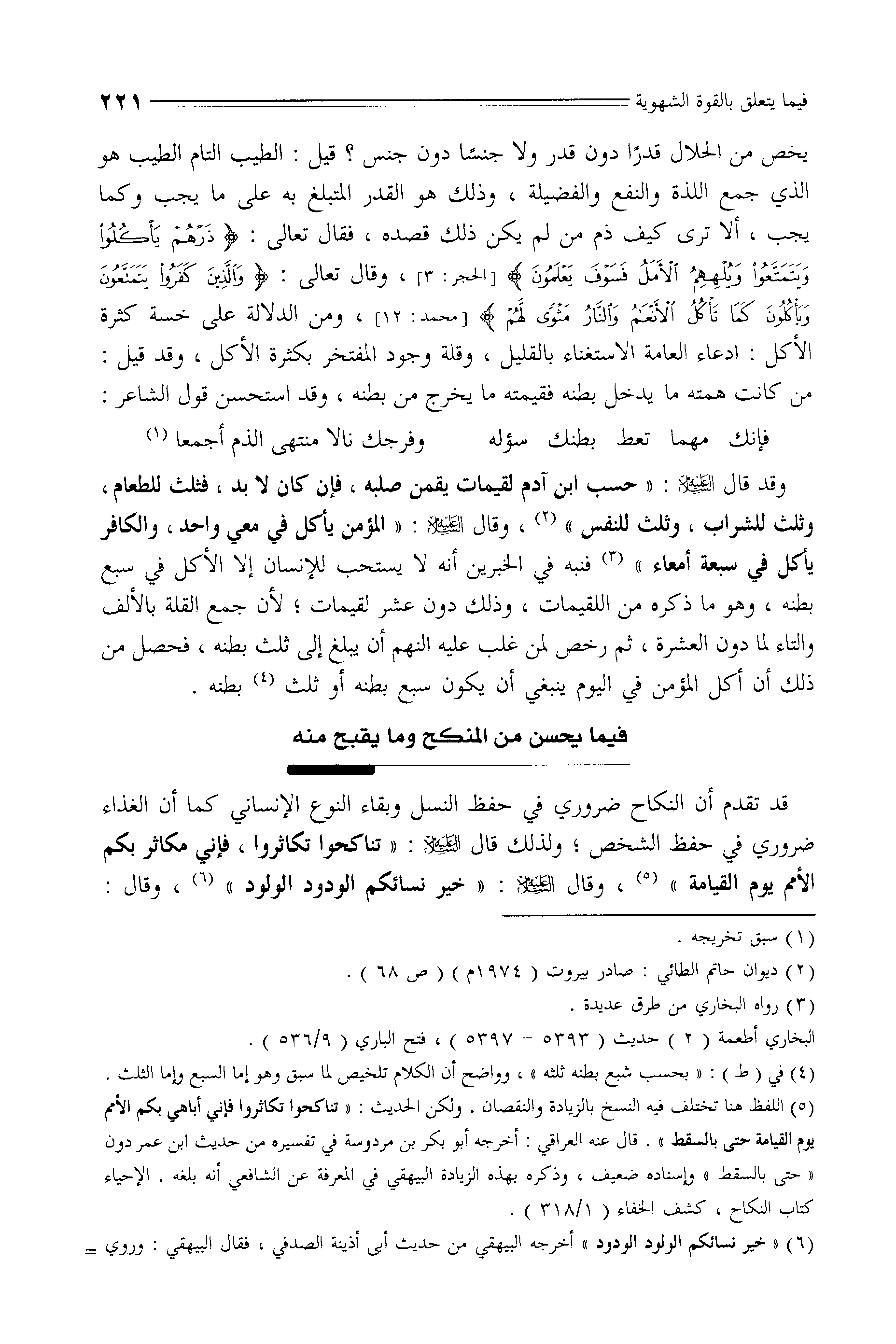 قد تقدم أن النكاح ضروري في حفظ النسل وبقاء النوع الإنساني كما أن الغذاء ضروري في حفظ الشخص، ولذلك قال - صلى الله عليه وسلم -: " تناكحوا تكاثروا، فإني مكاثر بكم الأمم يوم القيامة "، وقال - صلى الله عليه وسلم -: " خير نسائكم الودود الولود "، وقال: