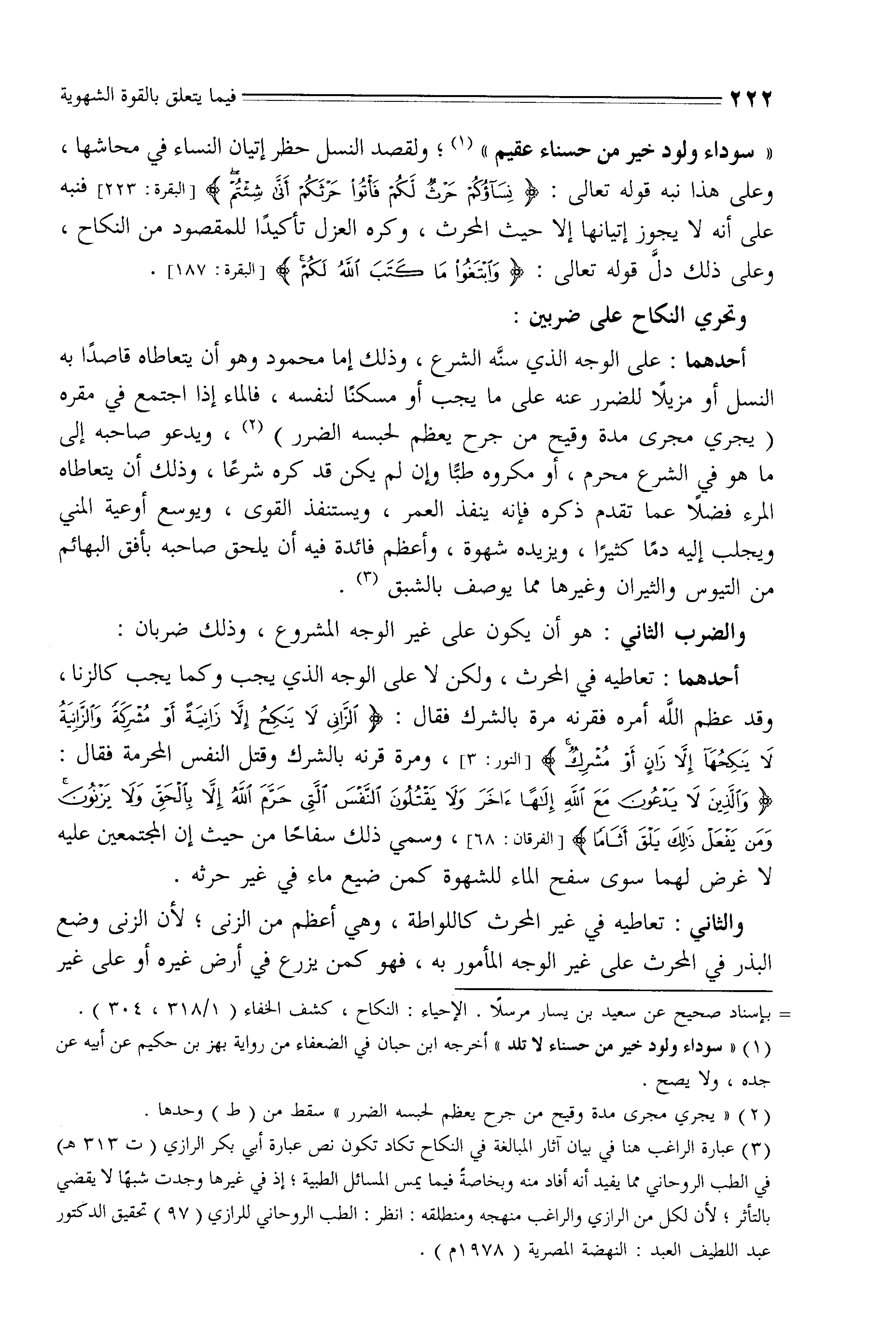 " سوداء ولود خير من حسناء عقيم "، ولقصد النسل حظر إتيان النساء في محاشها، وعلى هذا نبه قوله تعالى: (نِسَاؤُكُمْ حَرْثٌ لَكُمْ فَأْتُوا حَرْثَكُمْ أَنَّى شِئْتُمْ)