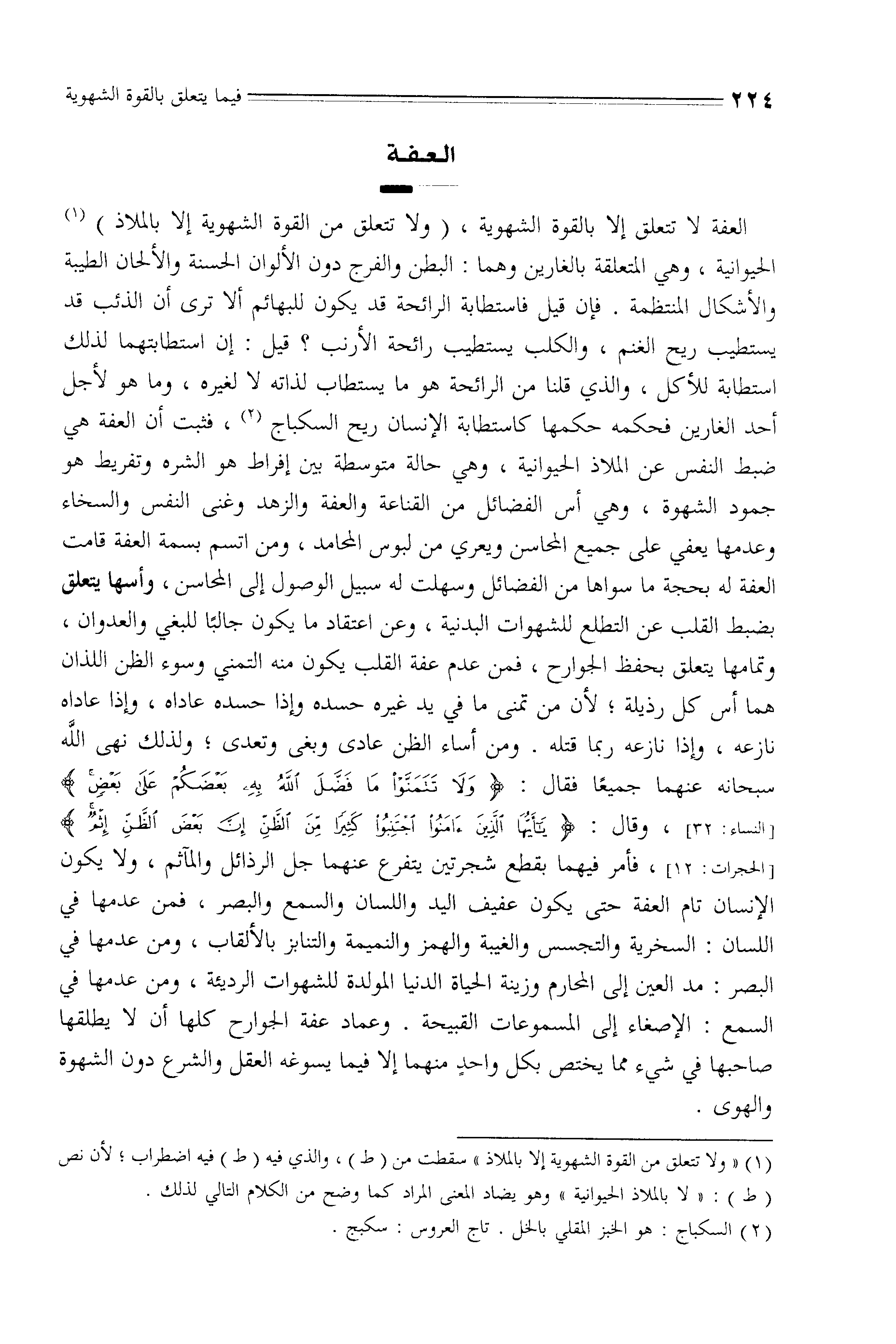 وعدمها يعفي على جميع المحاسن ويعري من لبوس المحامد، ومن اتسم بسمة العفة قامت العفة له بحجة ما سواها من الفضائل وسهلت له سبيل الوصول إلى المحاسن، وأسها يتعلق بضبط القلب عن التطلع للشهوات البدنية، وعن اعتقاد ما يكون جالبًا للبغي والعدوان، وتمامها يتعلق بحفظ الجوارح، فمن عدم عفة القلب يكون منه التمني وسوء الظن اللذان