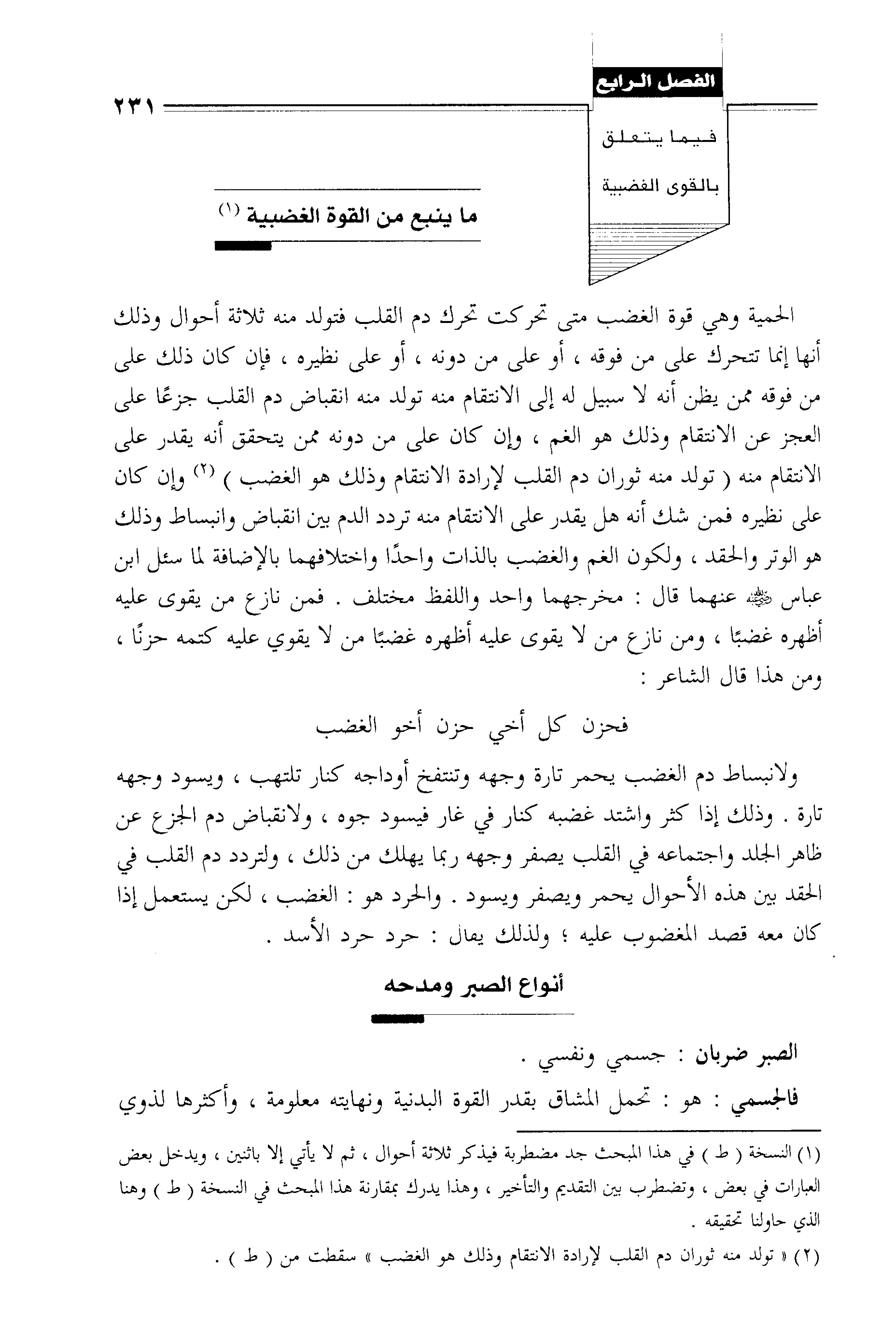 الحمية وهي قوة الغضب متى تحركت تحرك دم القلب فتولد منه ثلاثة أحوال وذلك أنها إنما تتحرك على من فوقه، أو على من دونه، أو على نظيره، فإن كان ذلك على من فوقه ممن أيقن أنه لا سبيل له إلى الانتقام منه تولد منه انقباض دم القلب جزعًا على العجز عن الانتقام وذلك هو الغم، وإن كان على من دونه ممن يتحقق أنه يقدر على الانتقام منه تولد منه ثوران دم القلب لإرادة الانتقام وذلك هو الغضب وإن كان على نظيره فمن شك أنه هل يقدر على الانتقام منه تردد الدم بين انقباض وانبساط وذلك