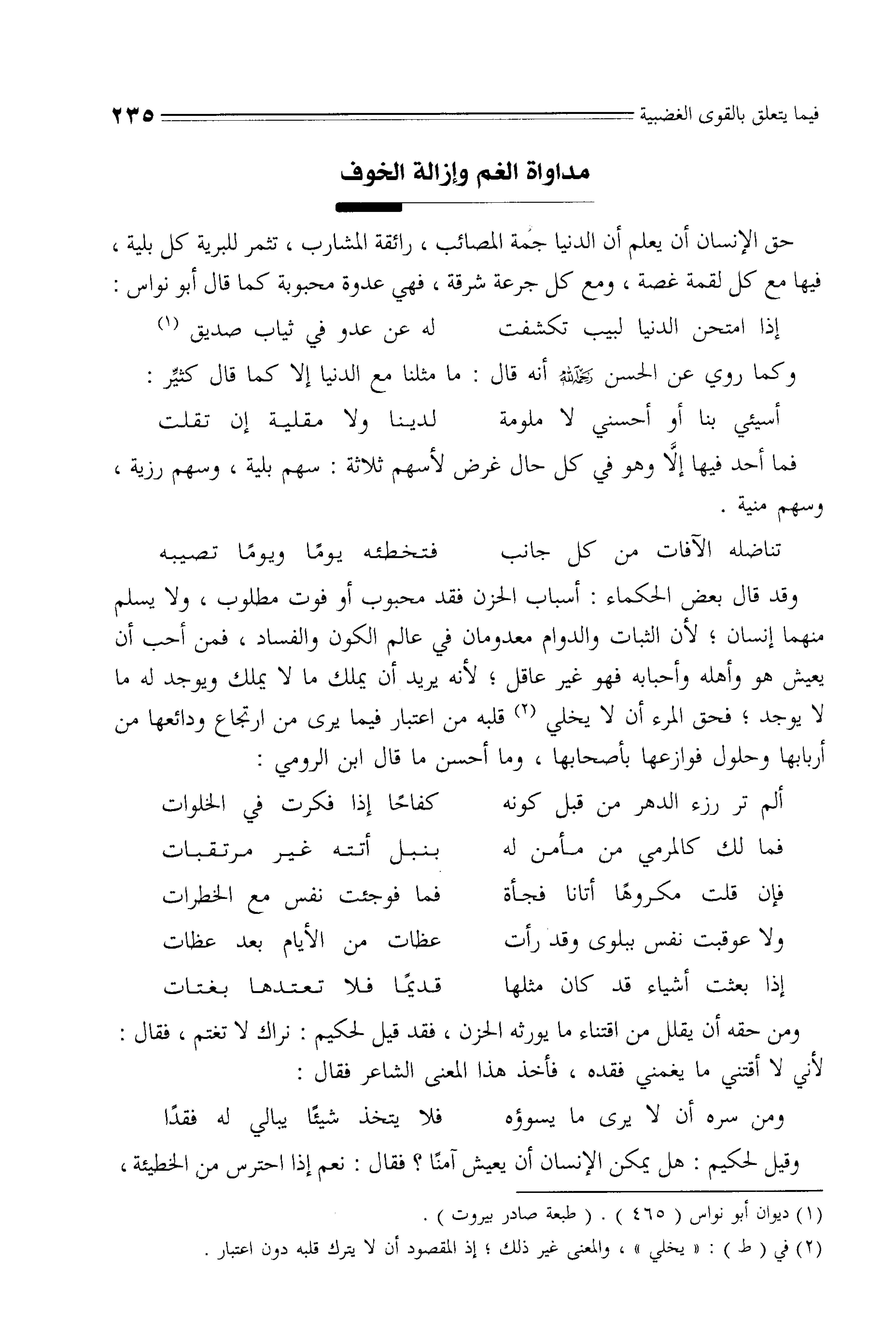 وقد قال بعض الحكماء: أسباب الحزن فقد محبوب أو فوت مطلوب، ولا يسلم منهما إنسان، لأن الثبات والدوام معدومان في عالم الكون والفساد، فمن أحب أن يعيش هو وأهله وأحبابه فهو غير عاقل، لأنه يريد أن يملك ما لا يملك ويوجد له ما لا يوجد " فحق المرء أن لا يخلي قلبه من اعتبار فيما يرى من ارتجاع ودائعها من أربابها وحلول فوازعها بأصحابها، وما أحسن ما قال ابن الرومي: