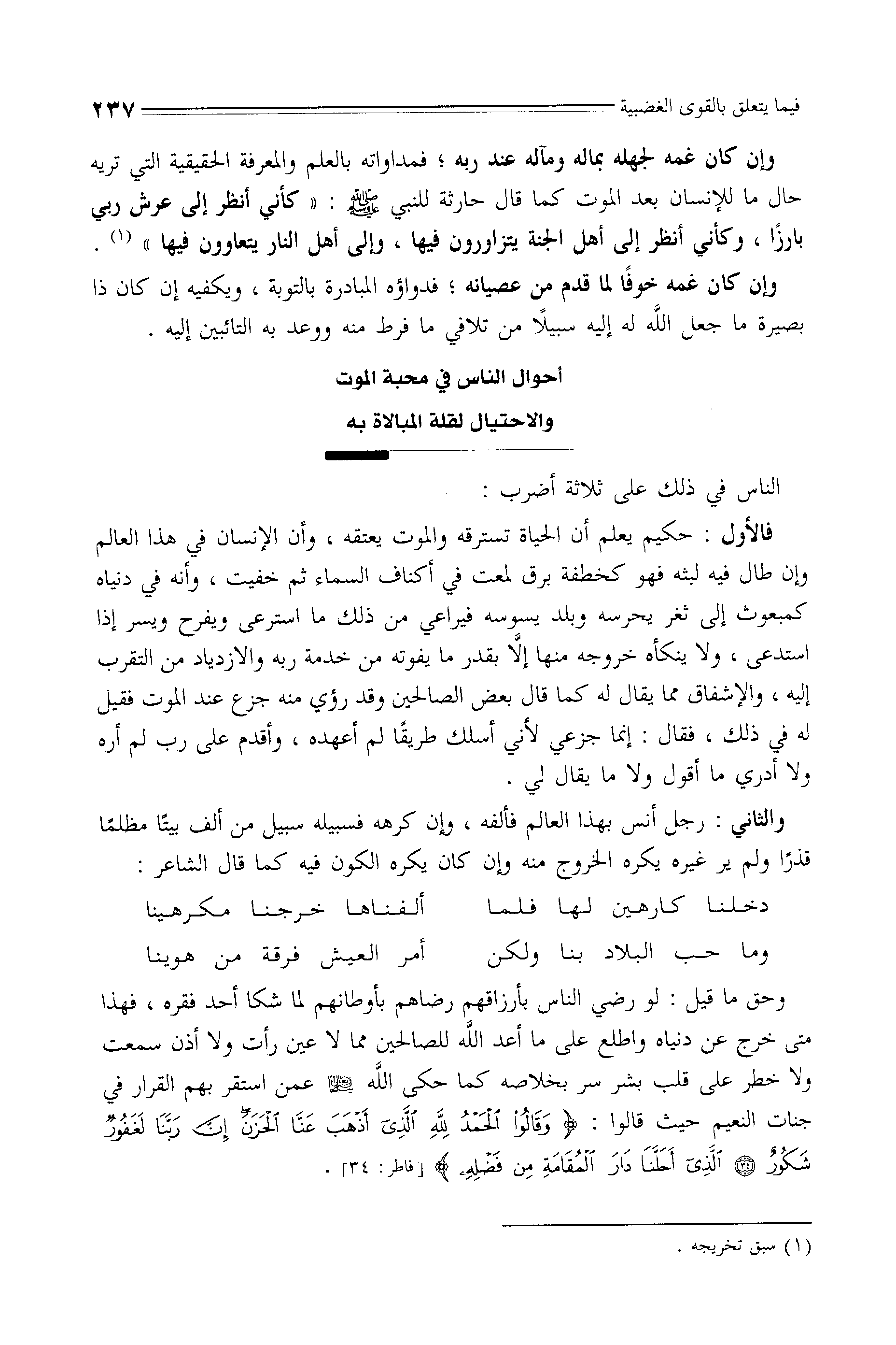 والثاني: رجل أنس بهذا العالم فألفه، وإن كرهه فسبيله سبيل من ألف بيتا مظلمًا قذرًا ولم ير غيره يكره الخروج منه وإن كان يكره الكون فيه كما قال الشاعر: