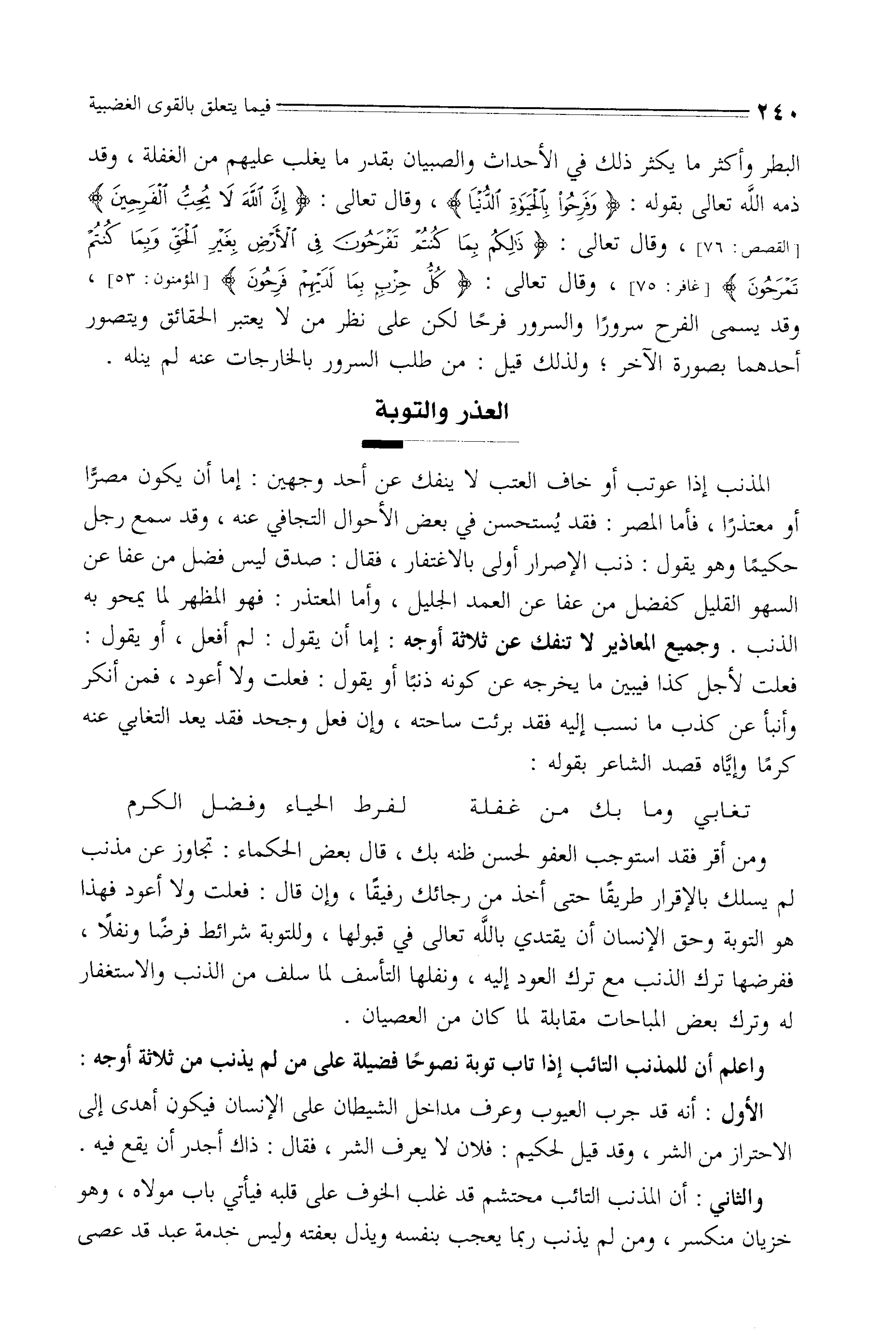 المذنب إذا عوتب أو خاف العتب لا ينفك عن أحد وجهين: إما أن يكون مصرًّا أو معتذرًا، فأما المصر: فقد يُستحسن في بعض الأحوال التجافي عنه، وقد سمع رجل حكيمًا وهو يقول: ذنب الإصرار أولى بالاغتفار، فقال: صدق ليس فضل من عفا عن السهو القليل كفضل من عفا عن العمد الجليل، وأما المعتذر: فهو المظهر لما يمحو به الذنب.