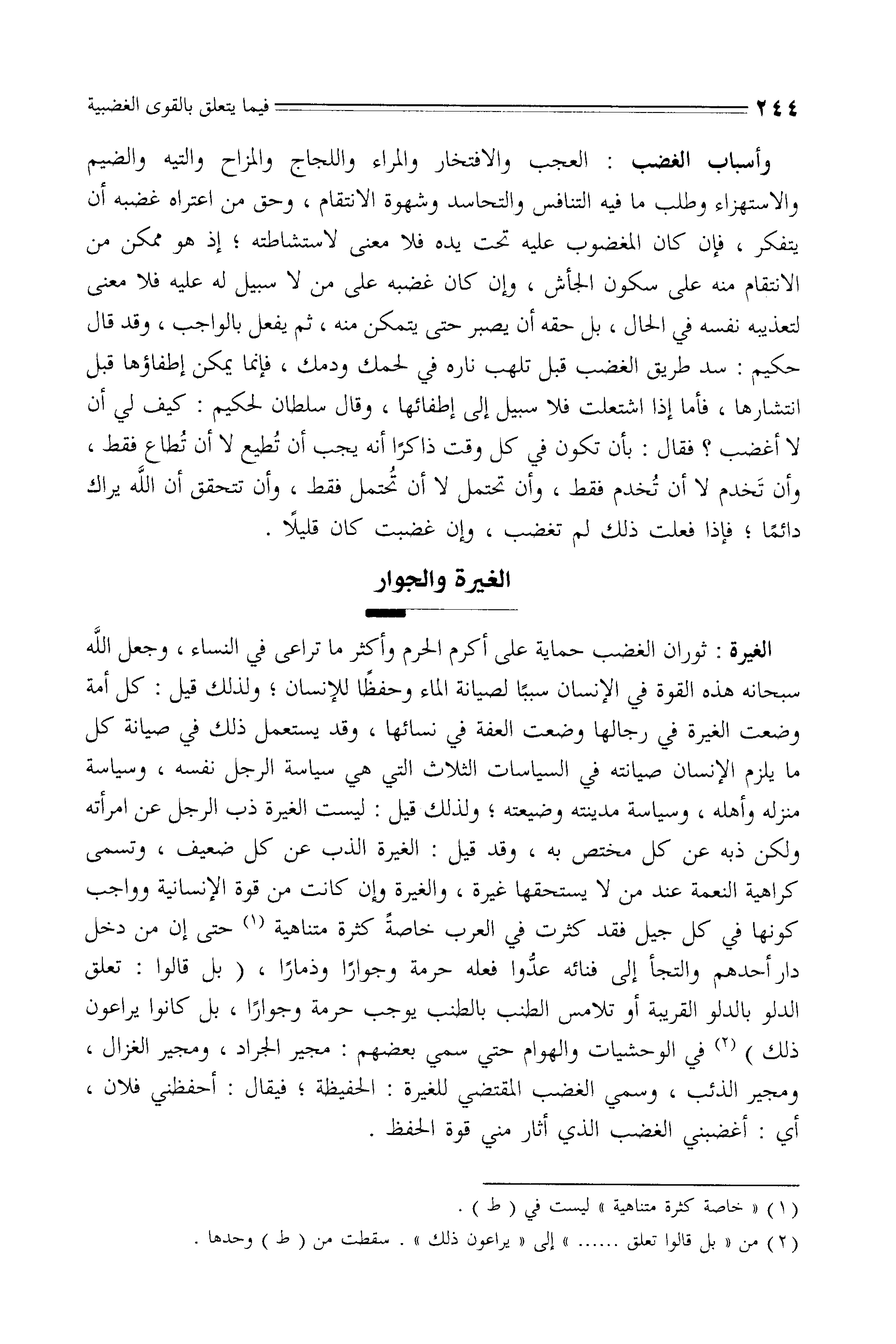 ولكن ذبه عن كل مختص به، وقد قيل: الغيرة الذب عن كل ضعيف، وتسمى كراهية النعمة عند من لا يستحقها غيرة، والغيرة وإن كانت من قوة الإنسانية وواجب كونها في كل جيل فقد كثرت في العرب خاصةً كثرة متناهية حتى إن من دخل دار أحدهم والتجأ إلى فنائه عدوا فعله حرمة وجوارًا وذمارًا، بل قالوا: تعلق الدلو بالدلو القريبة أو تلامس الطنب بالطنب يوجب حرمة وجوارًا، بل كانوا يراعون ذلك في الوحشيات والهوام حتي سمي بعضهم: مجير الجراد، ومجير الغزال، ومجير الذئب، وسمي الغضب المقتضي للغيرة: الحفيظة، فيقال: أحفظني فلان، أي: أغضبني الغضب الذي أثار مني قوة الحفظ.