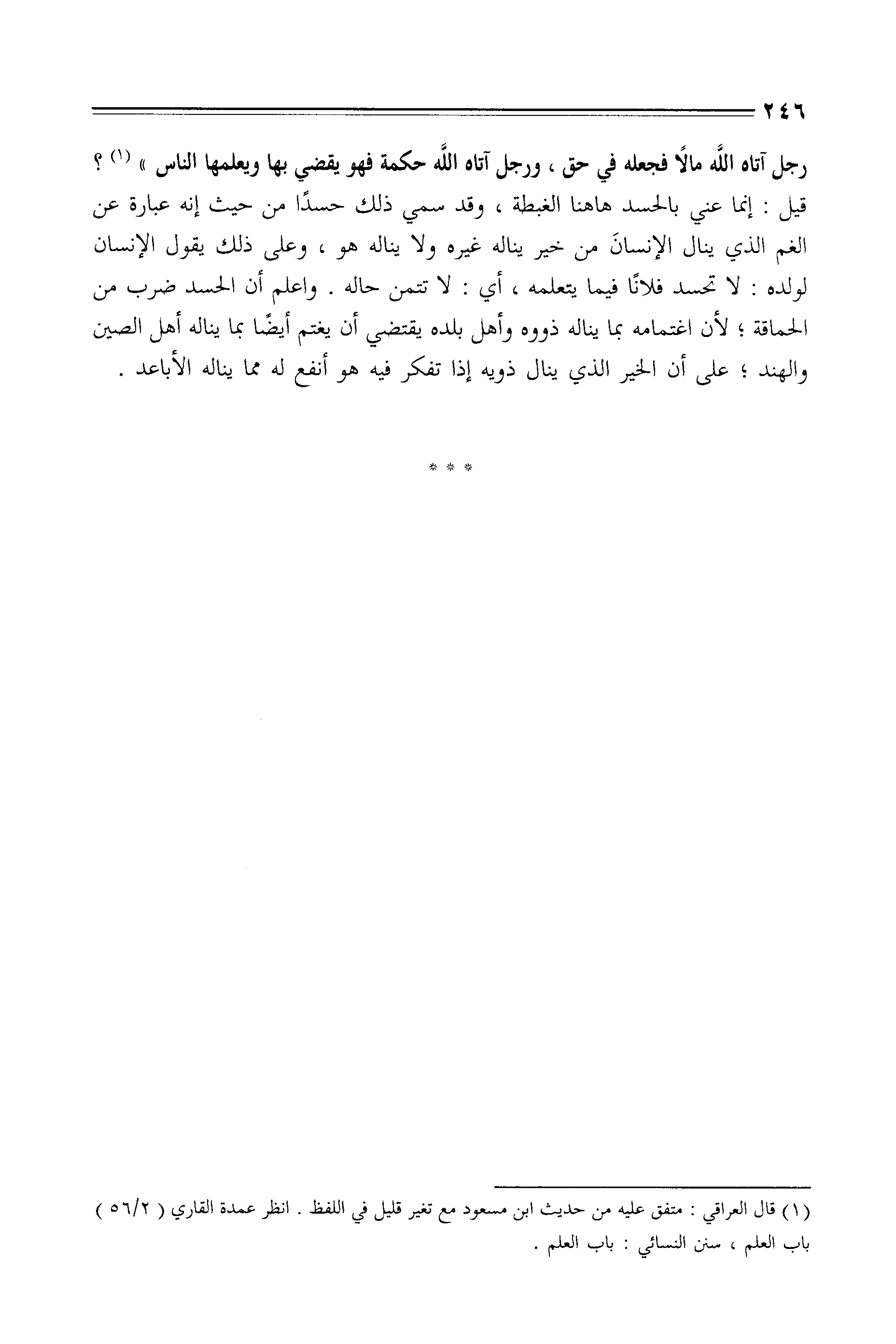 قيل: إنما عني بالحسد هاهنا الغبطة، وقد سمي ذلك حسدًا من حيث إنه عبارة عن الغم الذي ينال الإنسانَ من خير يناله غيره ولا يناله هو، وعلى ذلك يقول الإنسان لولده: لا تحسد فلانًا فيما يتعلمه، أي: لا تتمن حاله. واعلم أن الحسد ضرب من الحماقة، لأن اغتمامه بما يناله ذووه وأهل بلده يقتضي أن يغتم أيضًا بما يناله أهل الصين والهند، على أن الخير الذي ينال ذويه إذا تفكر فيه هو أنفع له مما يناله الأباعد.