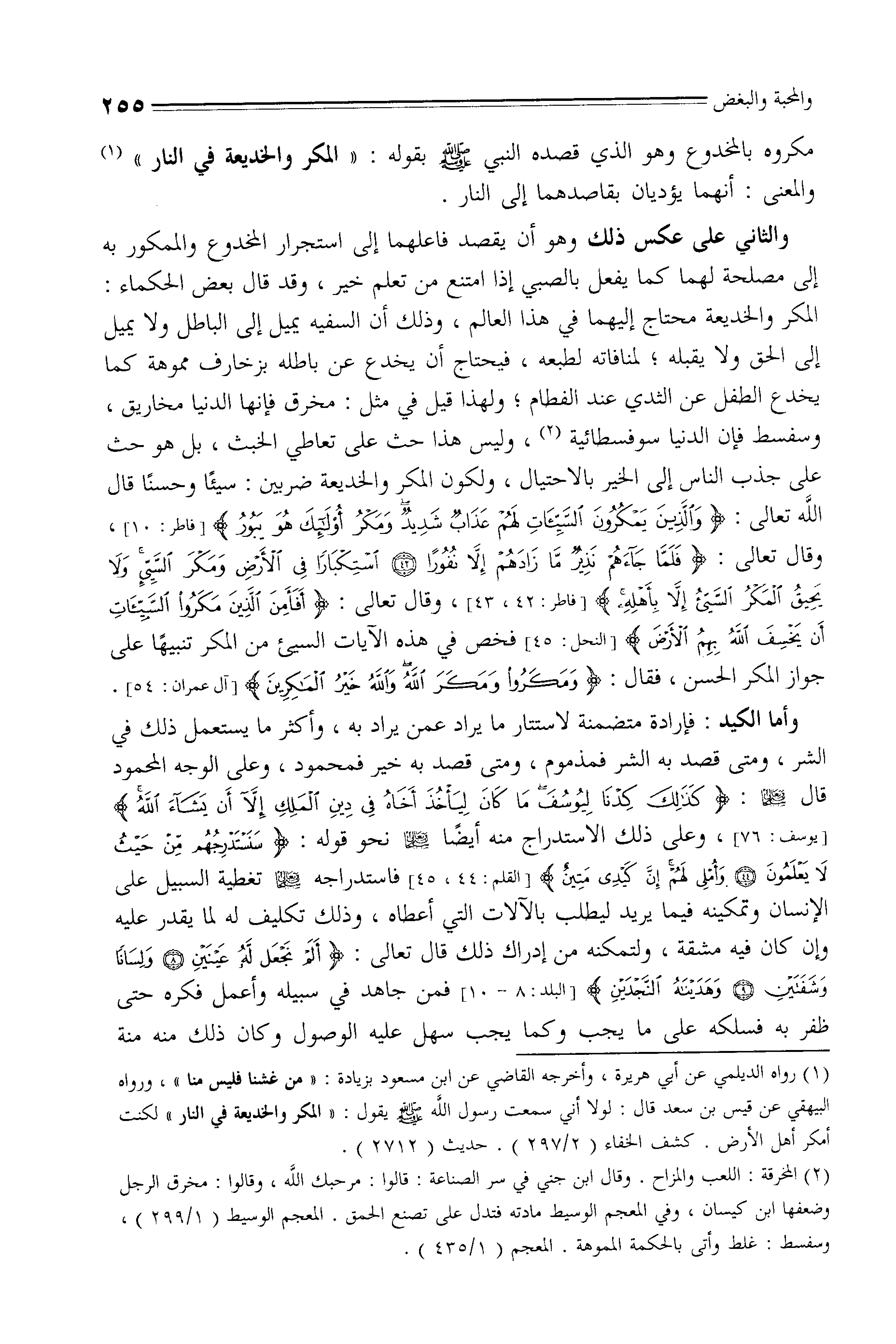 المكر والخديعة محتاج إليهما في هذا العالم، وذلك أن السفيه يميل إلى الباطل ولا يميل إلى الحق ولا يقبله " لمنافاته لطبعه، فيحتاج أن يخدع عن باطله بزخارف مموهة كما يخدع الطفل عن الثدي عند الفطام، ولهذا قيل في مثل: مخرق بأنها الدنيا مخاريق، وسفسط فإن الدنيا سوفسطائية، وليس هذا حث على تعاطي الخبث، بل هو حث على جذب الناس إلى الخير بالاحتيال، ولكون المكر والخديعة ضربين: سيئًا وحسنًا قال اللَّه تعالى: (وَالَّذِينَ يَمْكُرُونَ السَّيِّئَاتِ لَهُمْ عَذَابٌ شَدِيدٌ وَمَكْرُ أُولَئِكَ هُوَ يَبُورُ (10)