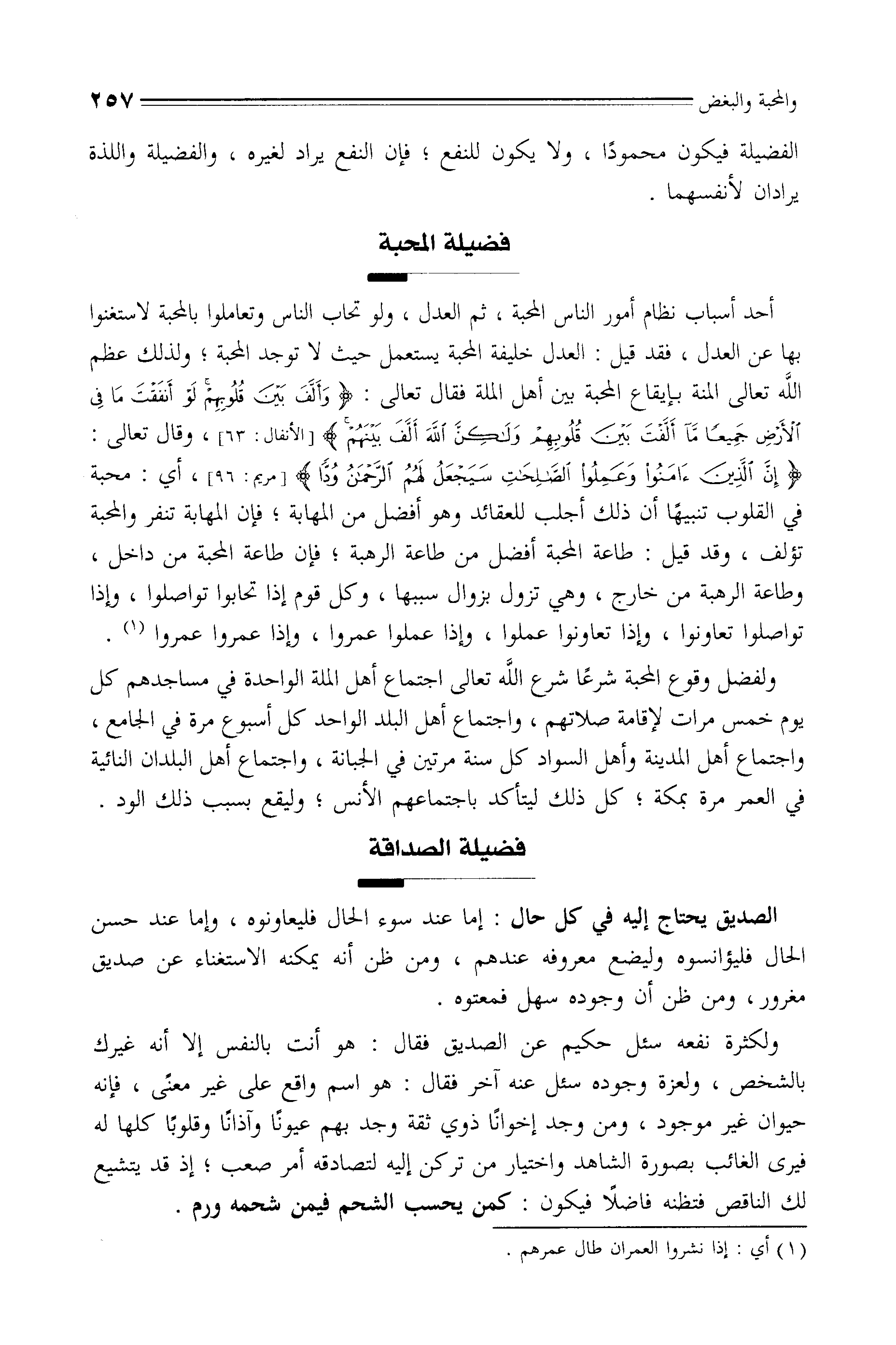 ولفضل وقوع المحبة شرعًا شرع الله تعالى اجتماع أهل الملة الواحدة في مساجدهم كل يوم خمس مرات لإقامة صلاتهم، واجتماع أهل البلد الواحد كل أسبوع مرة في الجامع،