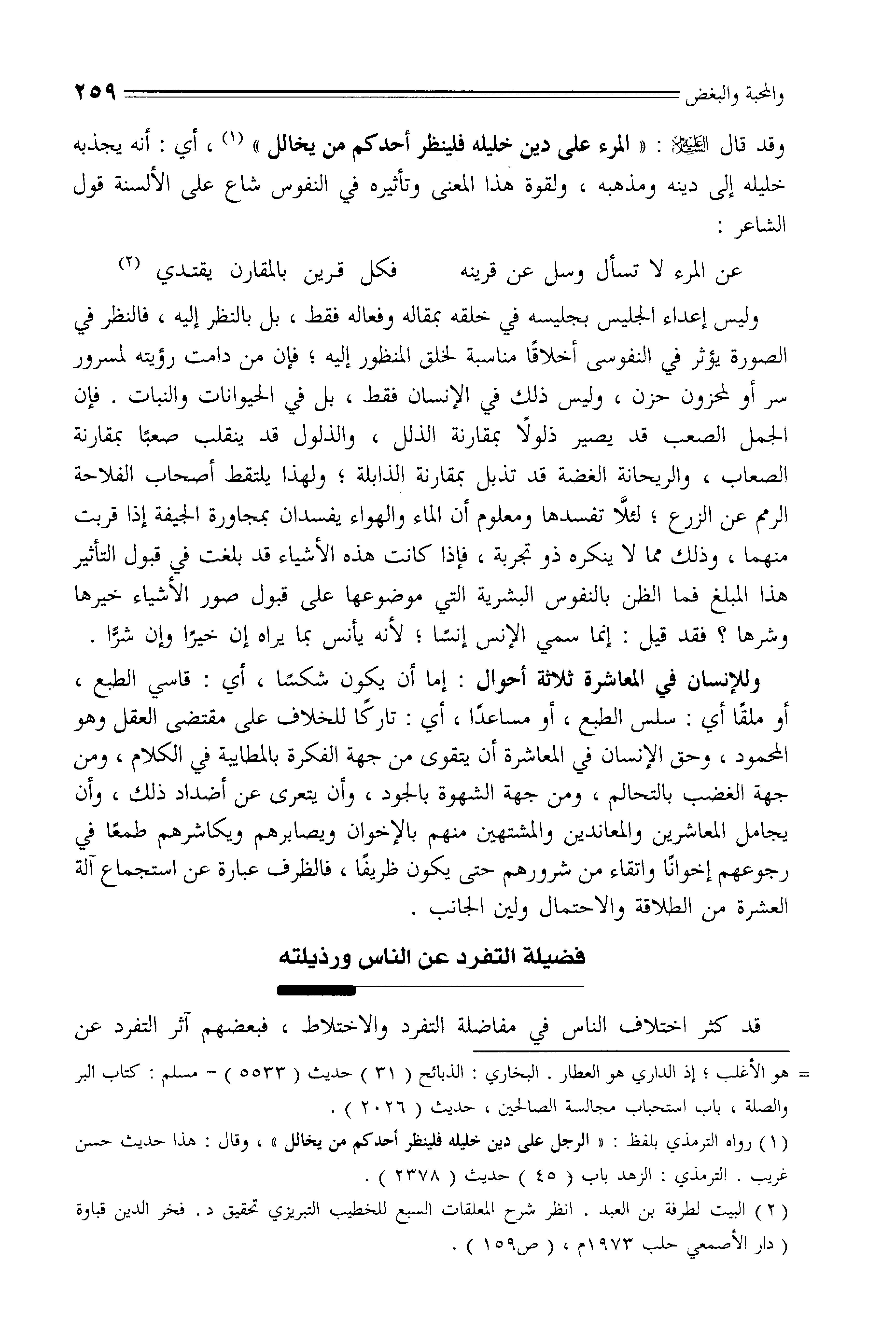 وقد قال - صلى الله عليه وسلم -: " المرء على دين خليله فلينظر أحدكم من يخالل "، أي: أنه يجذبه خليله إلى دينه ومذهبه، ولقوة هذا المعنى وتأثيره في النفوس شاع على الألسنة قول الشاعر: