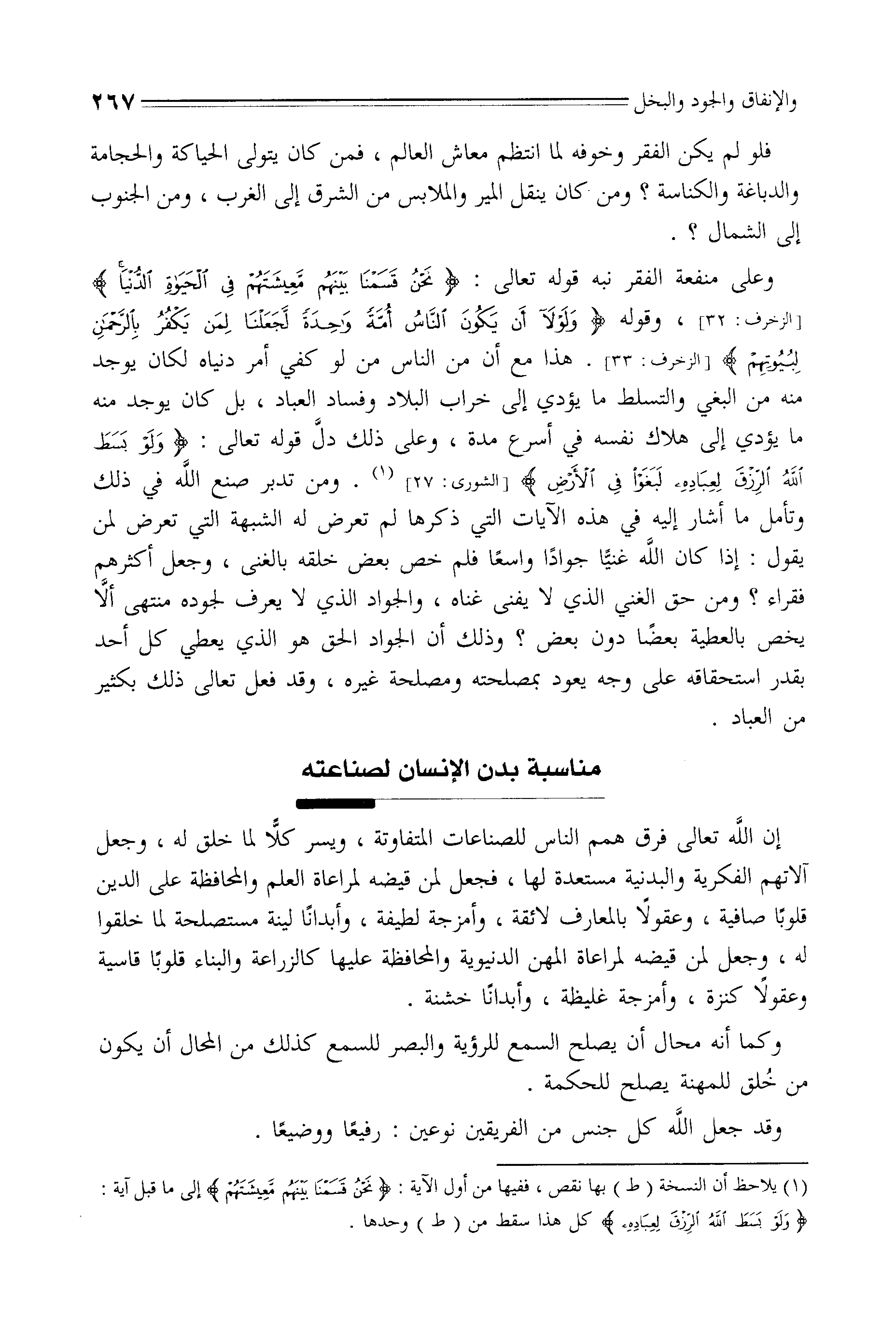 فلو لم يكن الفقر وخوفه لما انتظم معاش العالم، فمن كان يتولى الحياكة والحجامة والدباغة والكناسة، ومن كان ينعَل المير والملابس من الشرق إلى الغرب، ومن الجنوب إلى الشمال.
