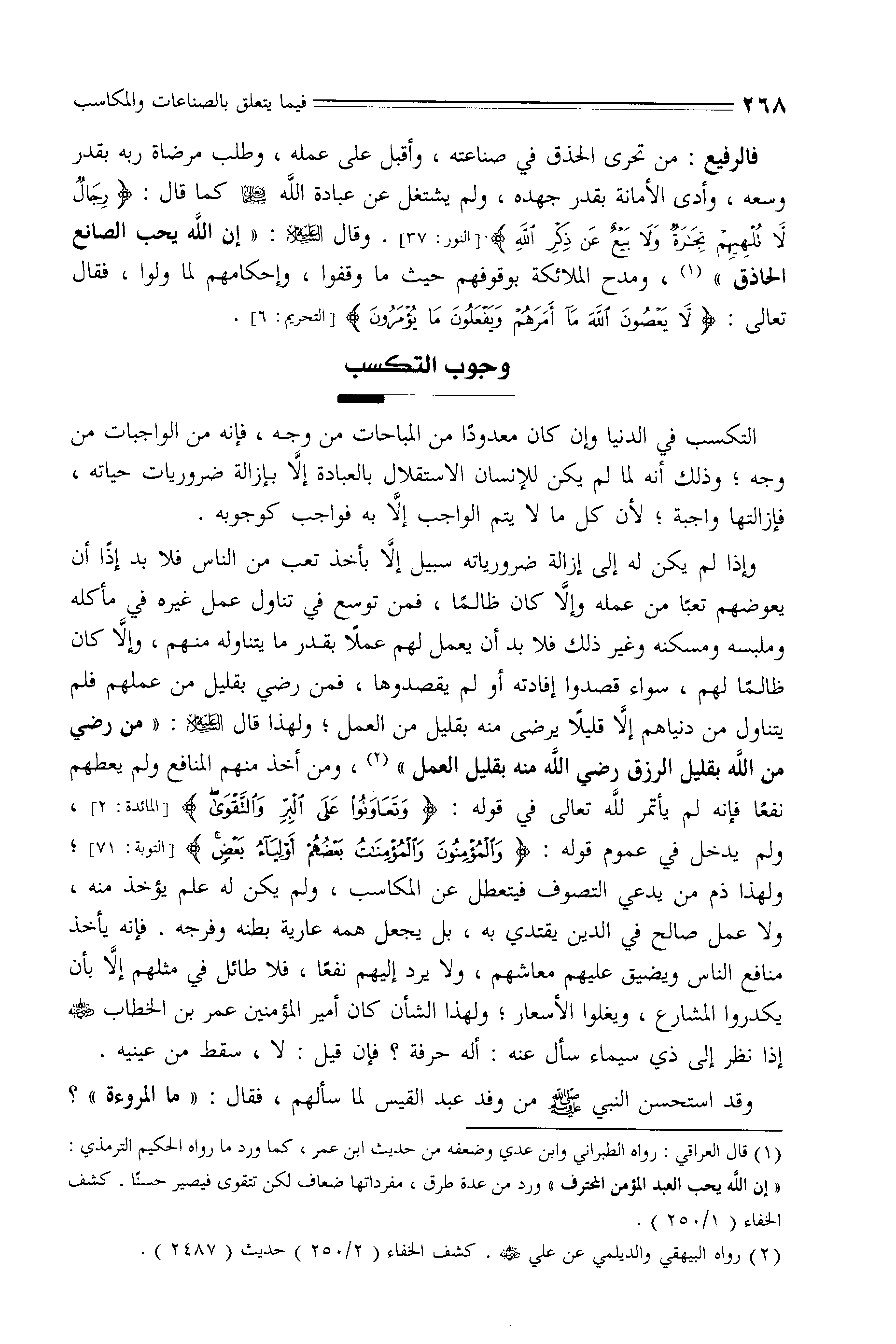 ولهذا ذم من يدعي التصوف فيتعطل عن المكاسب، ولم يكن له علم يؤخذ منه، ولا عمل صالح في الدين يقتدي به، بل يجعل همه عارية بطنه وفرجه. فإنه يأخذ منافع الناس ويضيق عليهم معاشهم، ولا يرد إليهم نفعًا، فلا طائل في مثلهم إلَّا بأن يكدروا المشارع، ويغلوا الأسعار، ولهذا الشأن كان أمير المؤمنين عمر بن الخطاب - رضي الله عنه - إذا نظر إلى ذي سيماء سأل عنه: أله حرفة، فإن قيل: لا، سقط من عينيه.