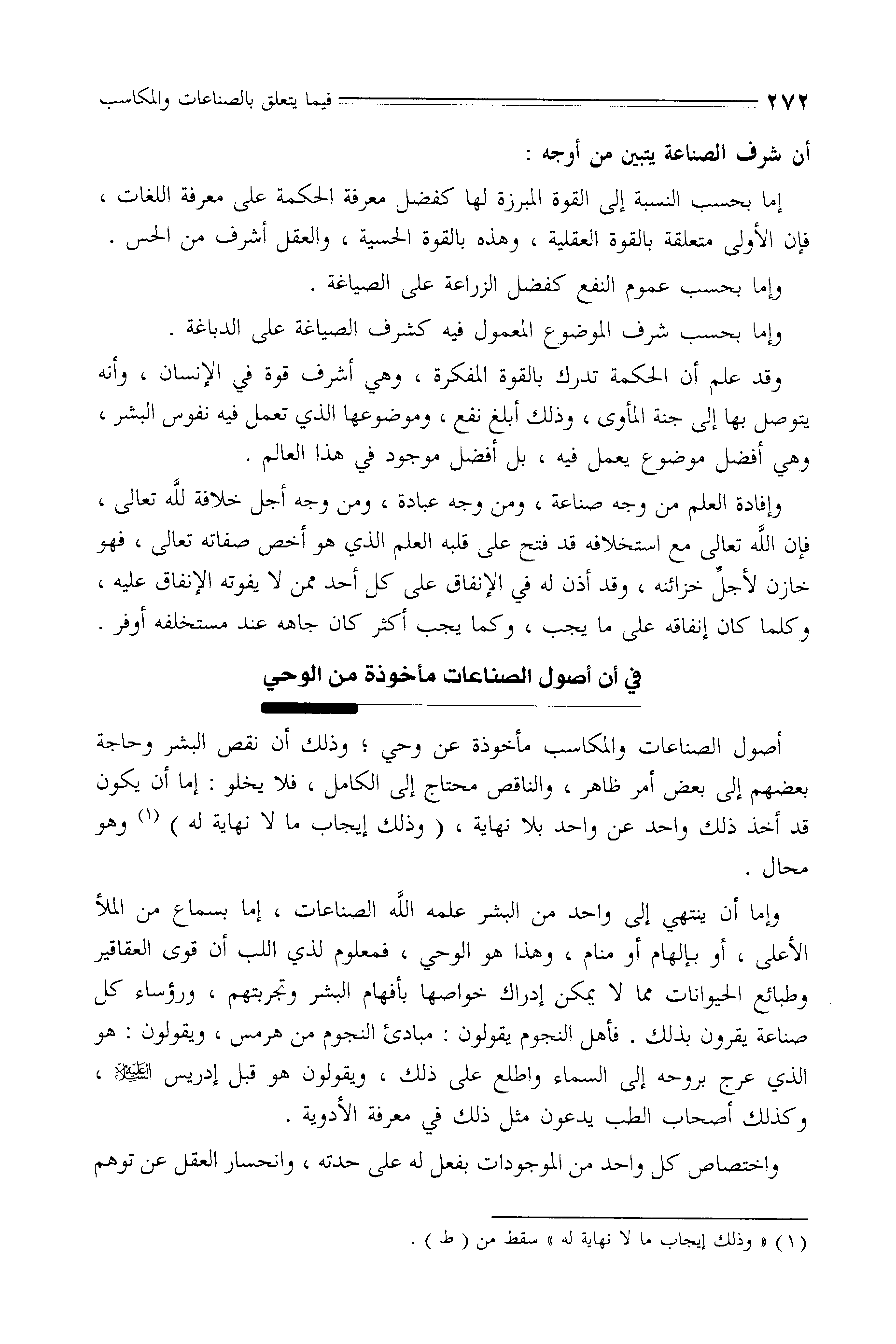 أصول الصناعات والمكاسب مأخوذة عن وحي، وذلك أن نقص البشر وحاجة بعضهم إلى بعض أمر ظاهر، والناقص محتاج إلى الكامل، فلا يخلو: إما أن يكون قد أخذ ذلك واحد عن واحد بلا نهاية، وذلك إيجاب ما لا نهاية له وهو محال.