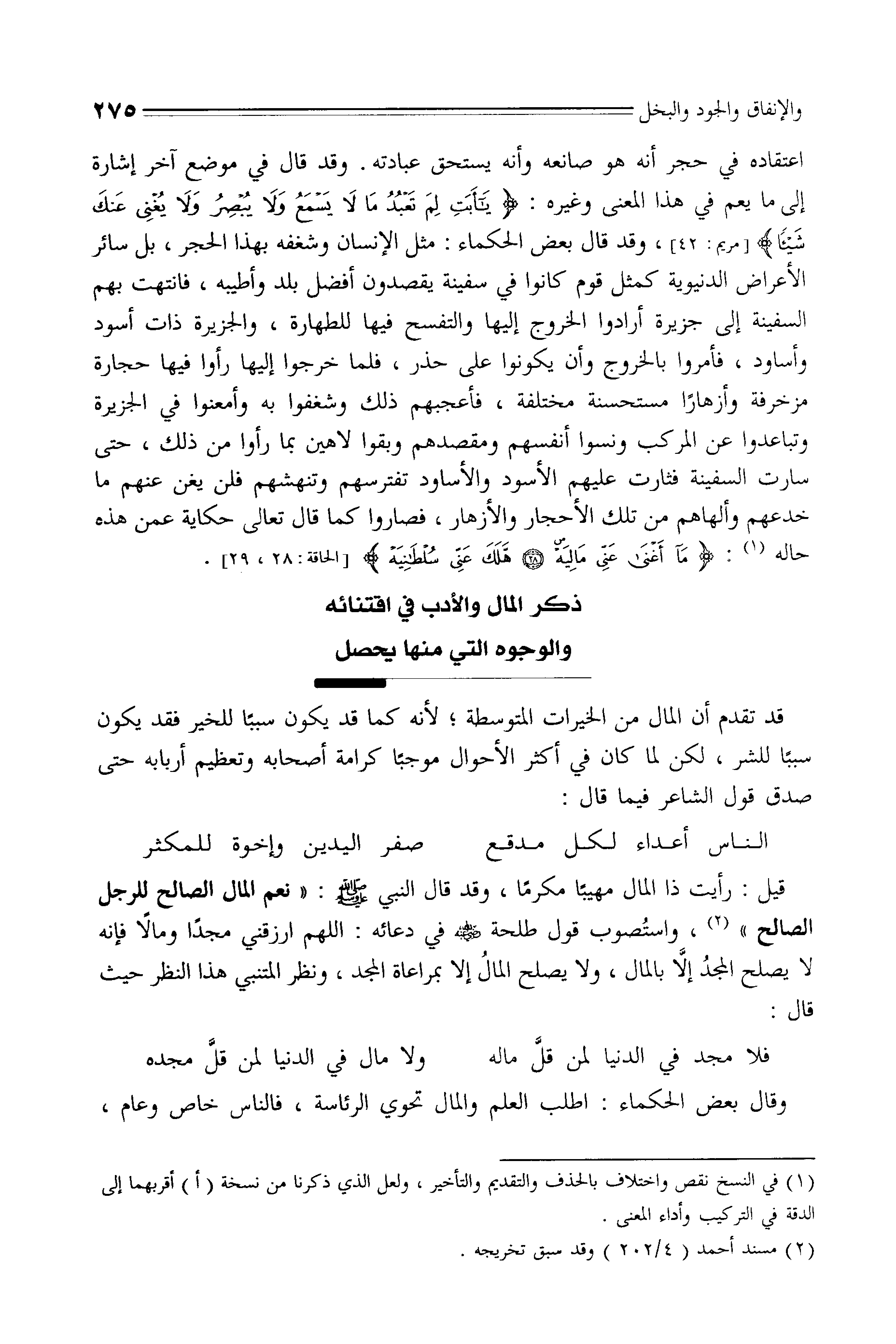 قيل: رأيت ذا المال مهيبًا مكرمًا، وقد قال النبي - صلى الله عليه وسلم -: " نعم المال الصالح للرجل الصالح "، واستُصوب قول طلحة - رضي الله عنه - في دعائه: اللهم ارزقني مجدًا ومالًا فإنه لا يصلح المجدُ إلَّا بالمال، ولا يصلح المالُ إلا بمراعاة المجد، ونظر المتنبى هذا النظر حيث قال: