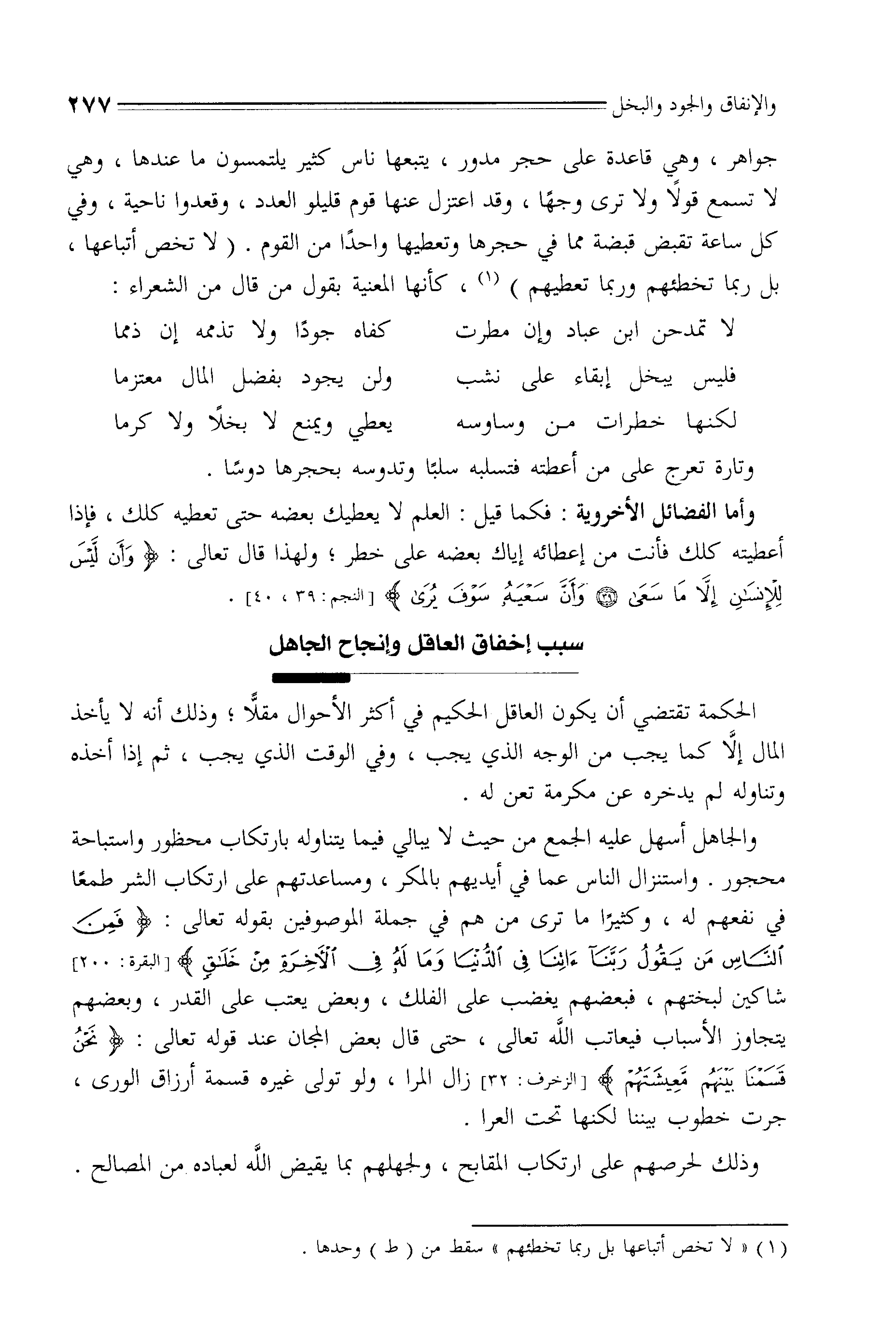 الحكمة تقتضي أن يكون العاقل الحكيم في أكثر الأحوال مقلًّا، وذلك أنه لا يأخذ المال إلَّا كما يجب من الوجه الذي يجب، وفي الوقت الذي يجب، ثم إذا أخذه وتناوله لم يدخره عن مكرمة تعن له.