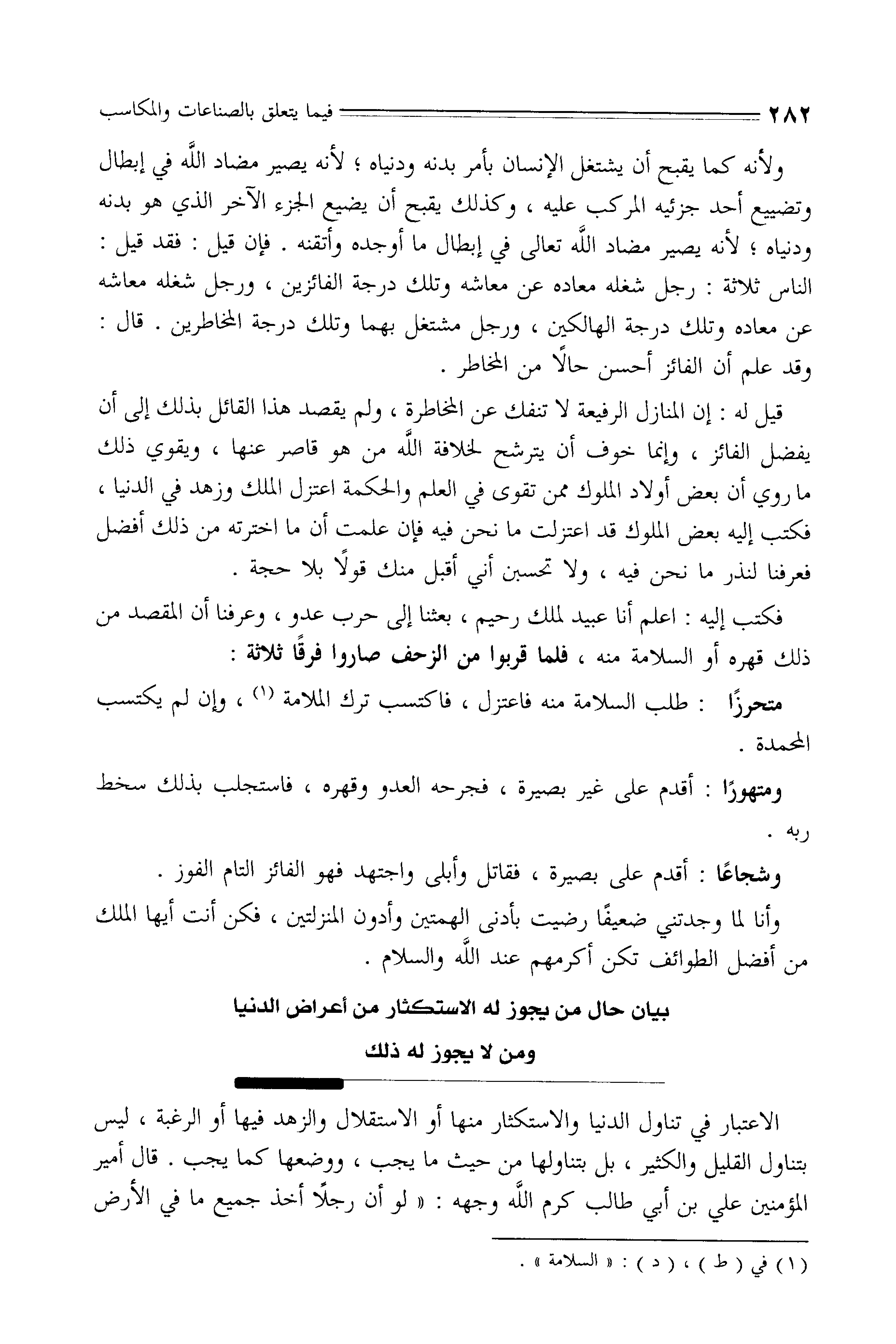 قيل له: إن المنازل الرفيعة لا تنفك عن المخاطرة، ولم يقصد هذا القائل بذلك إلى أن يفضل الفائز، وإنما خوف أن يترشح لخلافة اللَّه من هو قاصر عنها، ويقوي ذلك ما روي أن بعض أولاد الملوك ممن تقوى في العلم والحكمة اعتزل الملك وزهد في الدنيا، فكتب إليه بعض الملوك قد اعتزلت ما نحن فيه فإن علمت أن ما اخترته من ذلك أفضل فعرفنا لنذر ما نحن فيه، ولا تحسبن أني أقبل منك قولًا بلا حجة.