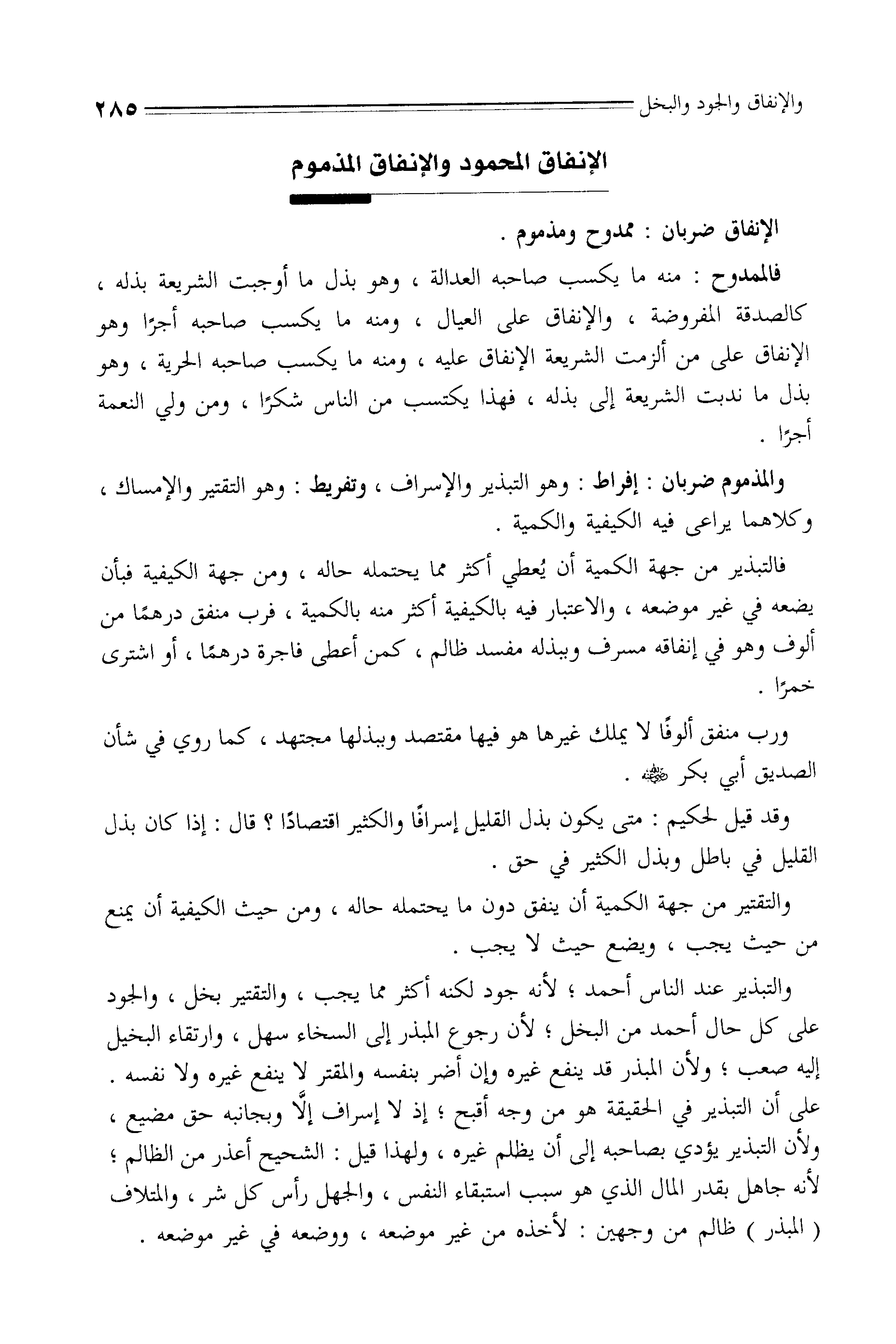 فمالممدوح: منه ما يكسب صاحبه العدالة، وهو بذل ما أوجبت الشريعة بذله، كالصدقة المفروضة، والإنفاق على العيال، ومنه ما يكسب صاحبه أجرًا وهو الإنفاق على من ألزمت الشريعة الإنفاق عليه، ومنه ما يكسب صاحبه الحرية، وهو بذل ما ندبت الشريعة إلى بذله، فهذا يكتسب من الناس شكرًا، ومن ولي النعمة أجرًا.