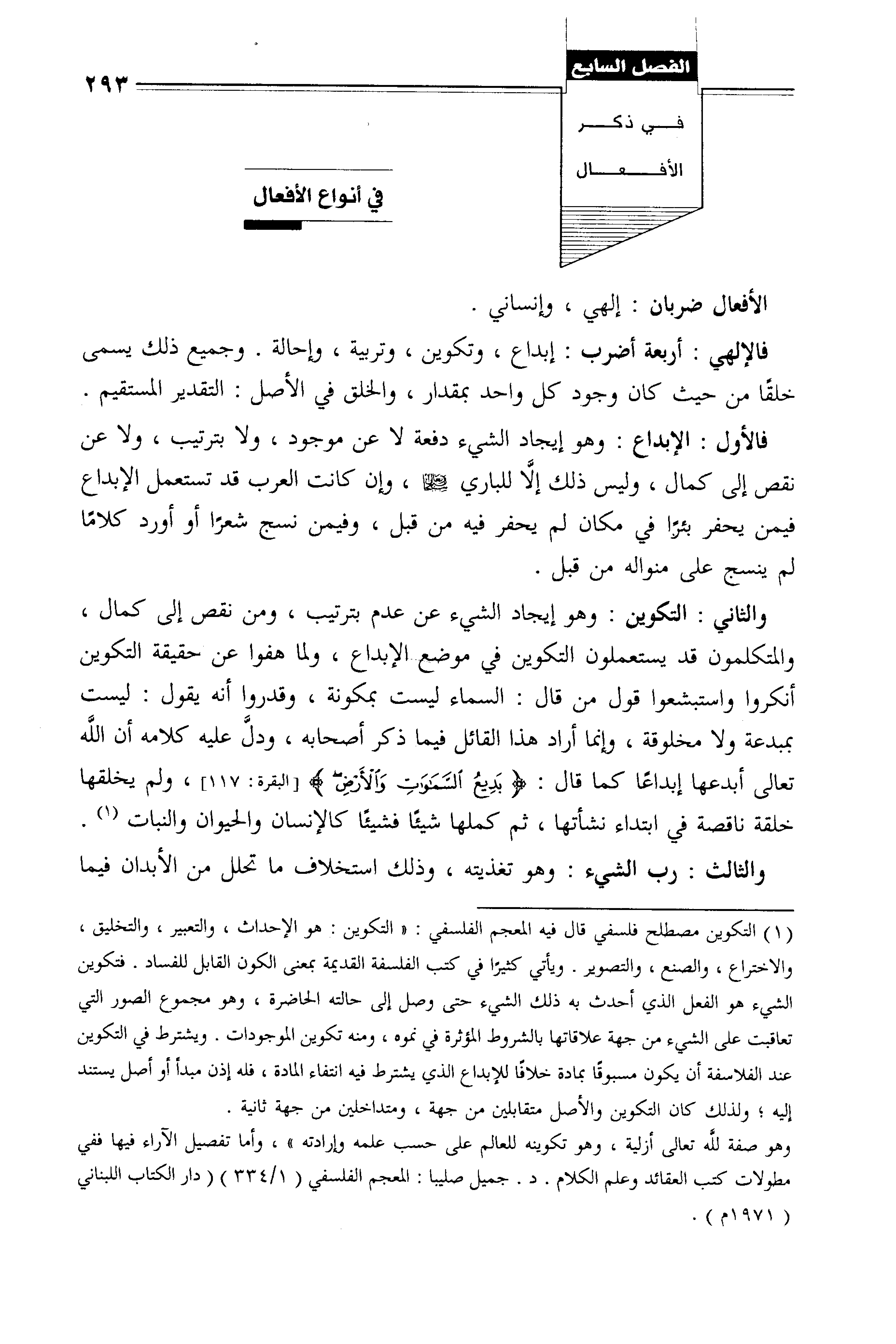 فالأول: الإبداع: وهو إيجاد الشيء دفعة لا عن موجود، ولا بترتيب، ولا عن نقص إلى كمال، وليس ذلك إلَّا للباري - عز وجل -، وإن كانت العرب قد تستعمل الإبداع