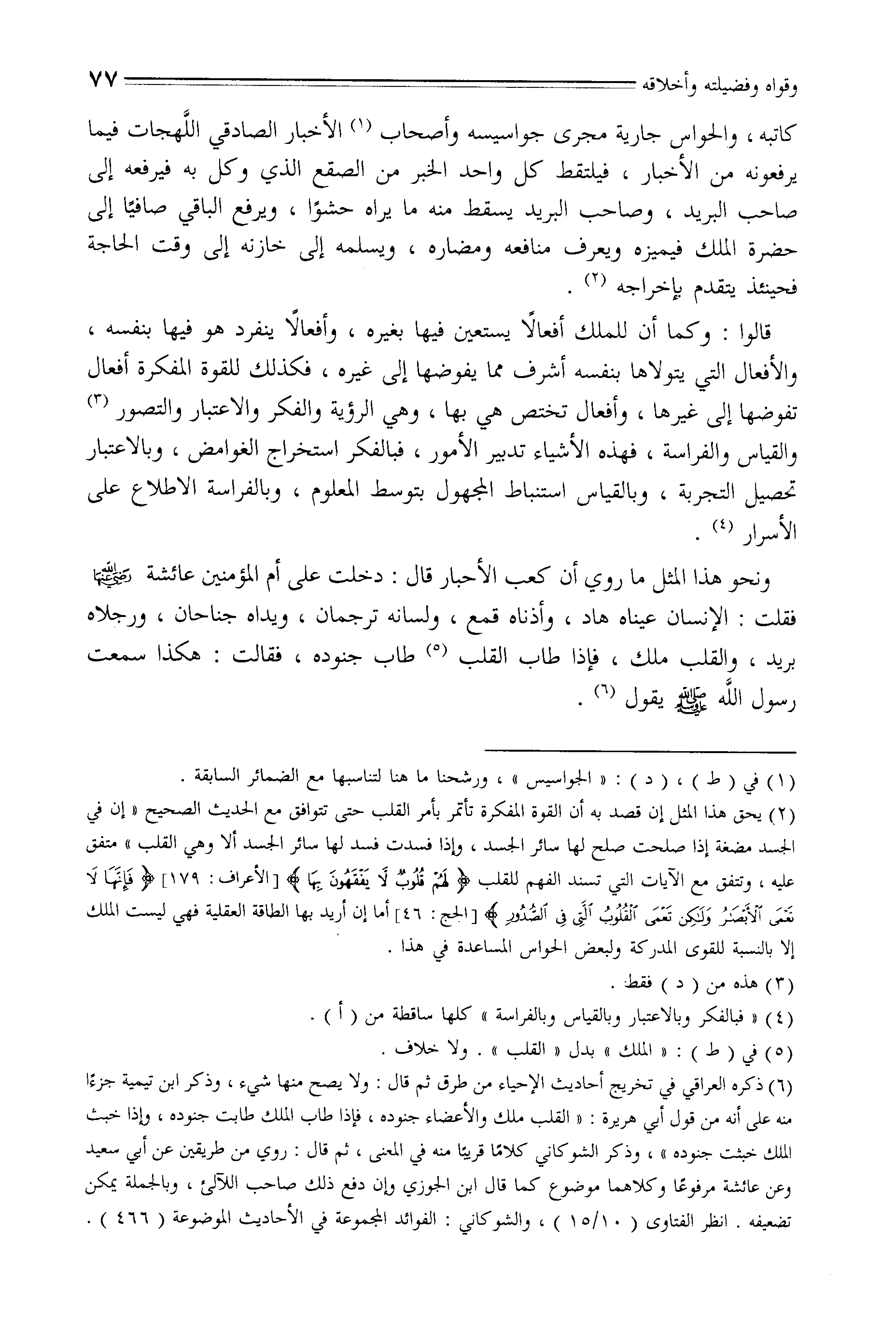 فقلت: الإنسان عيناه هاد، وأذناه قمع، ولسانه ترجمان، ويداه جناحان، ورجلاه بريد، والقلب ملك، فإذا طاب القلب طاب جنوده، فقالت: هكذا سمعت رسول اللَّه - صلى الله عليه وسلم - يقول.