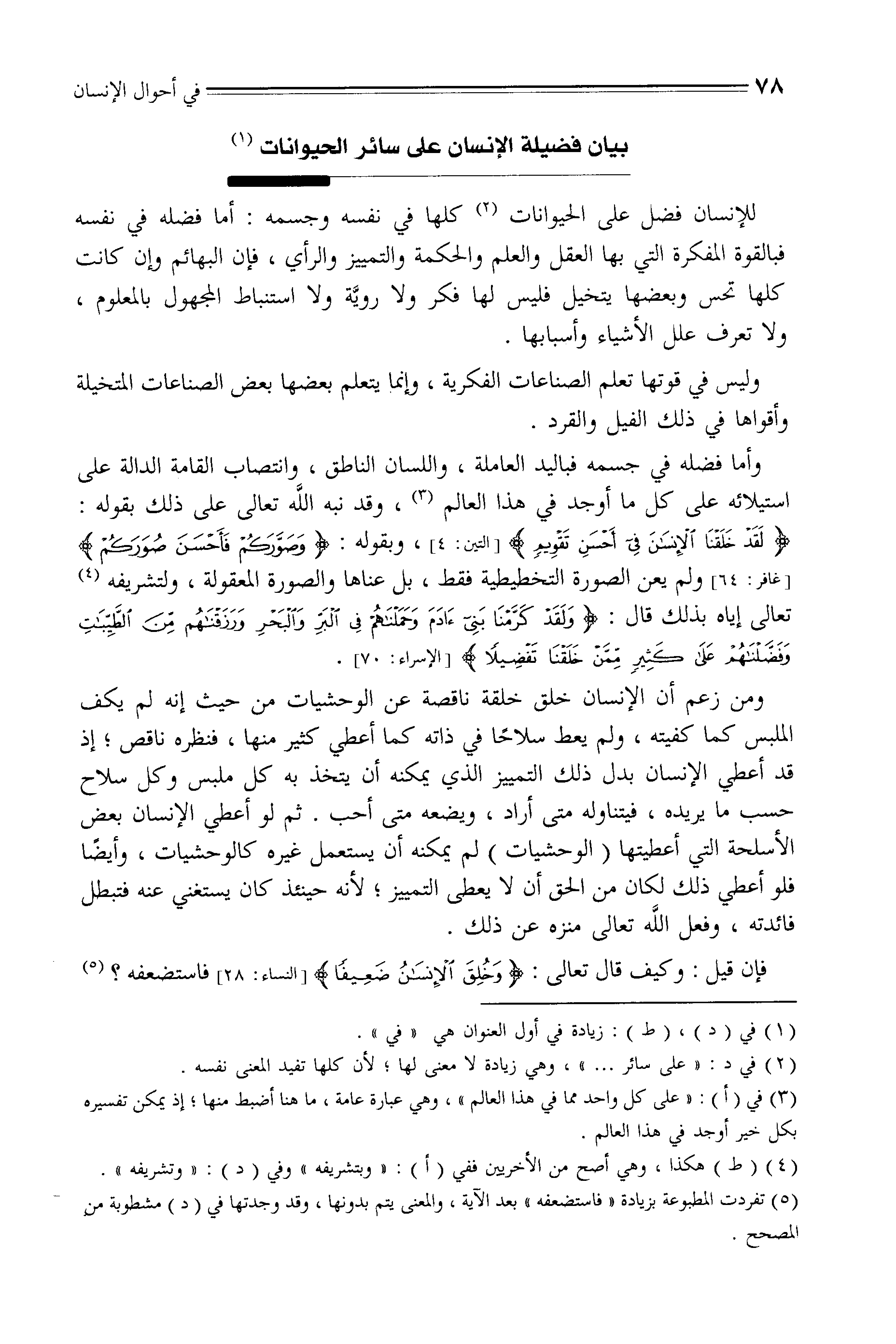 وأما فضله في جسمه فباليد العاملة، واللسان الناطق، وانتصاب القامة الدالة على استيلائه على كل ما أوجد في هذا العالم، وقد نبه الله تعالى على ذلك بقوله: (لَقَدْ خَلَقْنَا الْإِنْسَانَ فِي أَحْسَنِ تَقْوِيمٍ (4)