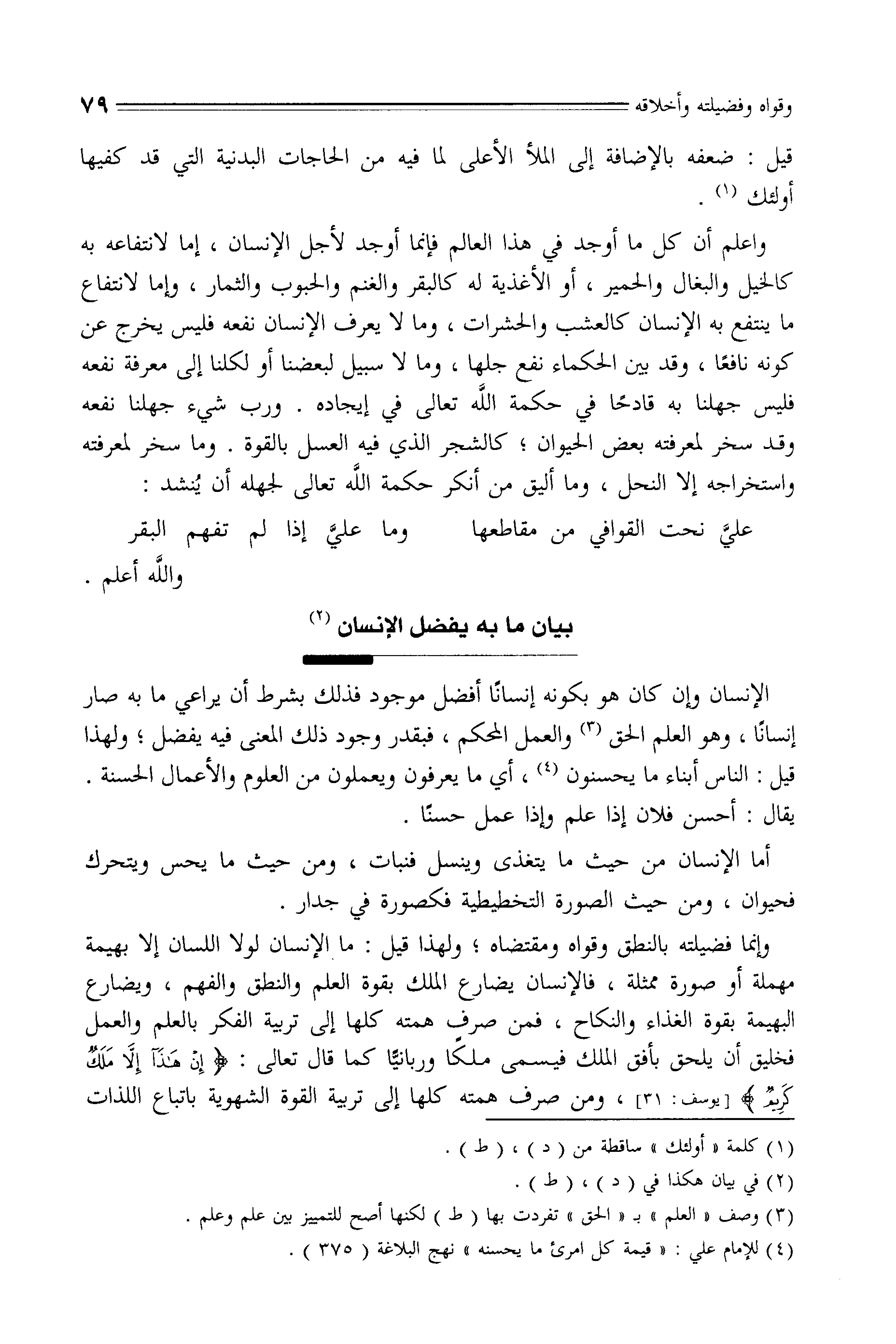 الإنسان وإن كان هو بكونه إنسانًا أفضل موجود فذلك بشرط أن يراعي ما به صار إنسانًا، وهو العلم الحق والعمل المحكم، فبقدر وجود ذلك المعنى فيه يفضل؛ ولهذا قيل: الناس أبناء ما يحسنون، أي ما يعرفون ويعملون من العلوم والأعمال الحسنة.