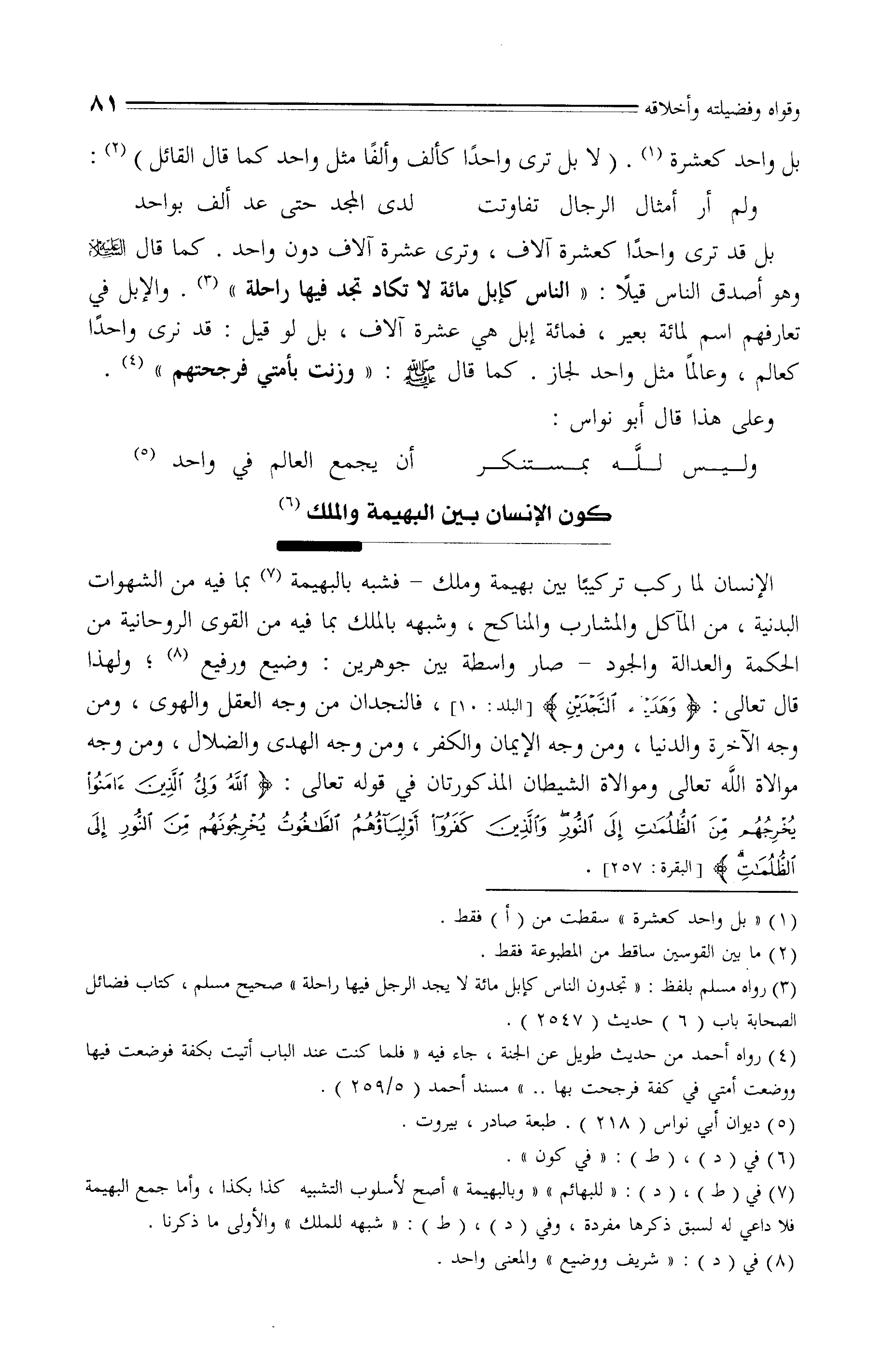الإنسان لما ركب تركيبًا بين بهيمة وملك - فشبه بالبهيمة بما فيه من الشهوات البدنية، من المآكل والمشارب والمناكح، شبهه بالملك بما فيه من القوى الروحانية من الحكمة والعدالة والجود - صار واسطة بين جوهرين: وضيع ورفيع؛ ولهذا قال تعالى: (وَهَدَيْنَاهُ النَّجْدَيْنِ (10) ،