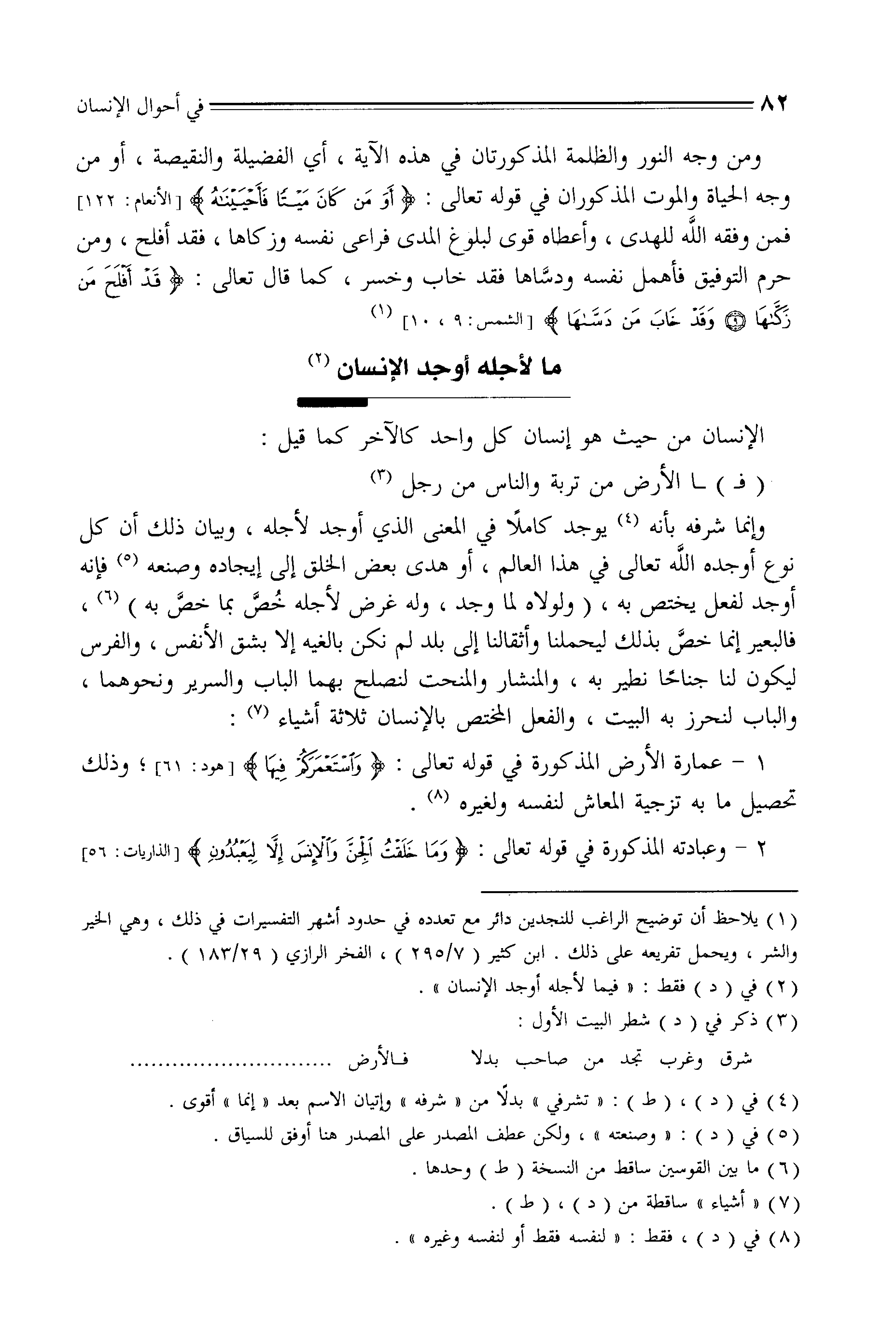 ومن وجه النور والظلمة المذكورتان في هذه الآية، أي الفضيلة والنقيصة، أو من وجه الحياة والموت المذكوران في قوله تعالى: (أَوَمَنْ كَانَ مَيْتًا فَأَحْيَيْنَاهُ) ،