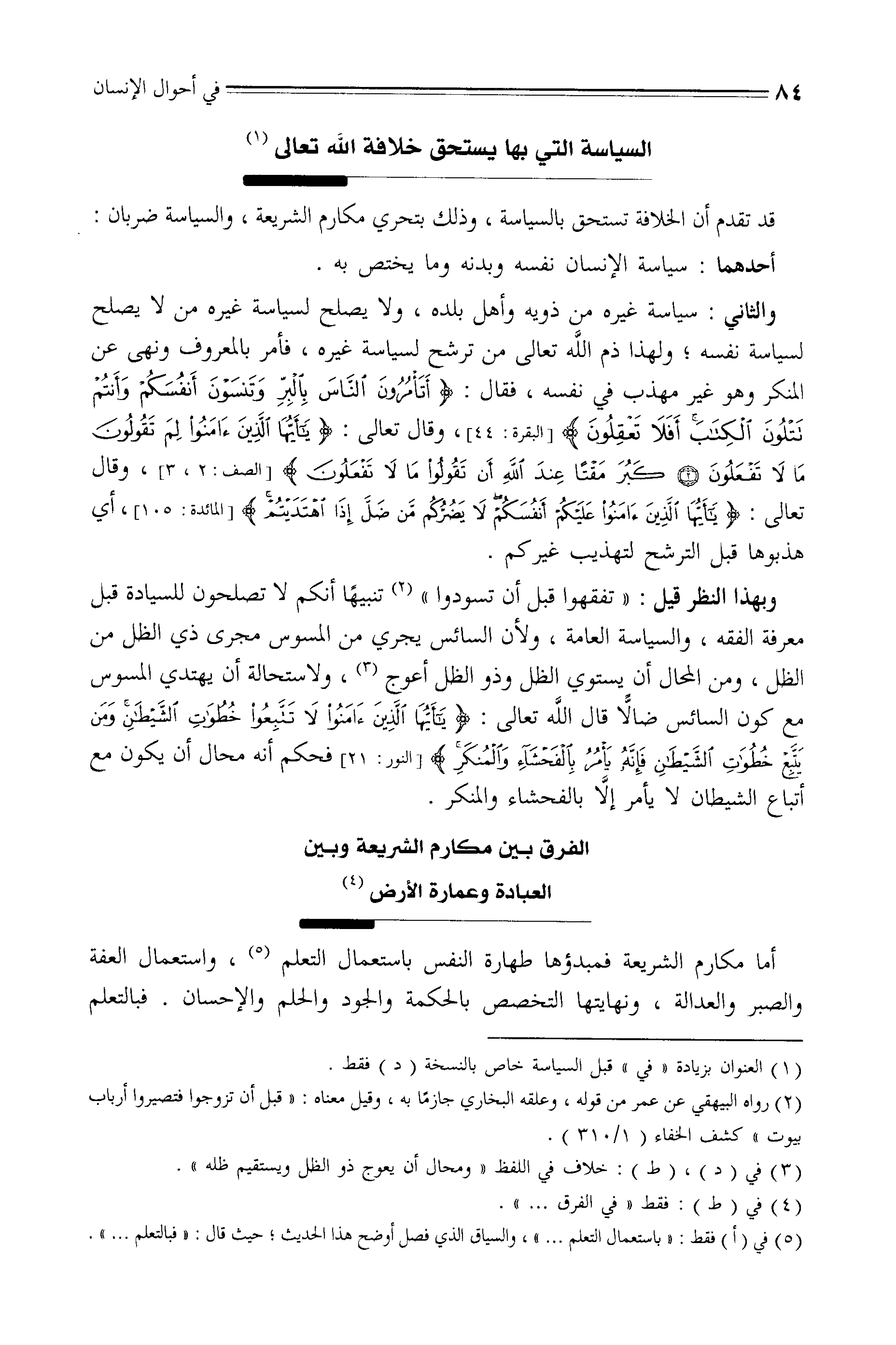 وبهذا النظر قيل: " تفقهوا قبل أن تسودوا " تنبيهًا أنكم لا تصلحون للسيادة قبل معرفة الفقه، والسياسة العامة، ولأن السائس يجري من المسوس مجرى ذي الظل من الظل، ومن المحال أن يستوي الظل وذو الظل أعوج، ولاستحالة أن يهتدي المسوس مع كون السائس ضالّا قال اللَّه تعالى: (يَا أَيُّهَا الَّذِينَ آمَنُوا لَا تَتَّبِعُوا خُطُوَاتِ الشَّيْطَانِ وَمَنْ يَتَّبِعْ خُطُوَاتِ الشَّيْطَانِ فَإِنَّهُ يَأْمُرُ بِالْفَحْشَاءِ وَالْمُنْكَرِ) ،