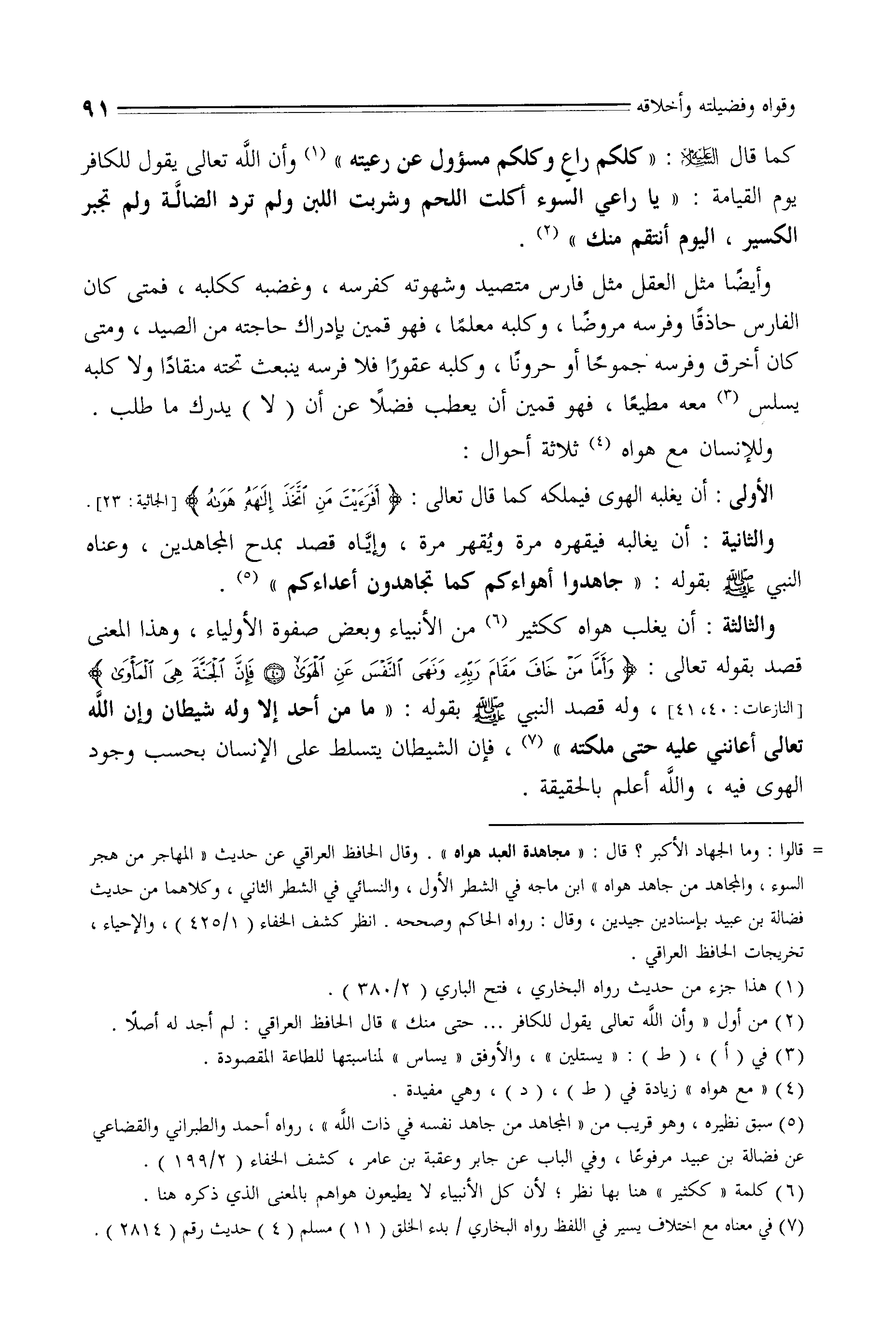 والثانية: أن يغالبه فيقهره مرة ويُقهر مرة، وإيَّاه قصد بمدح المجاهدين، وعناه النبي - صلى الله عليه وسلم - بقوله: " جاهدوا أهواءكم كما تجاهدون أعداءكم ".
