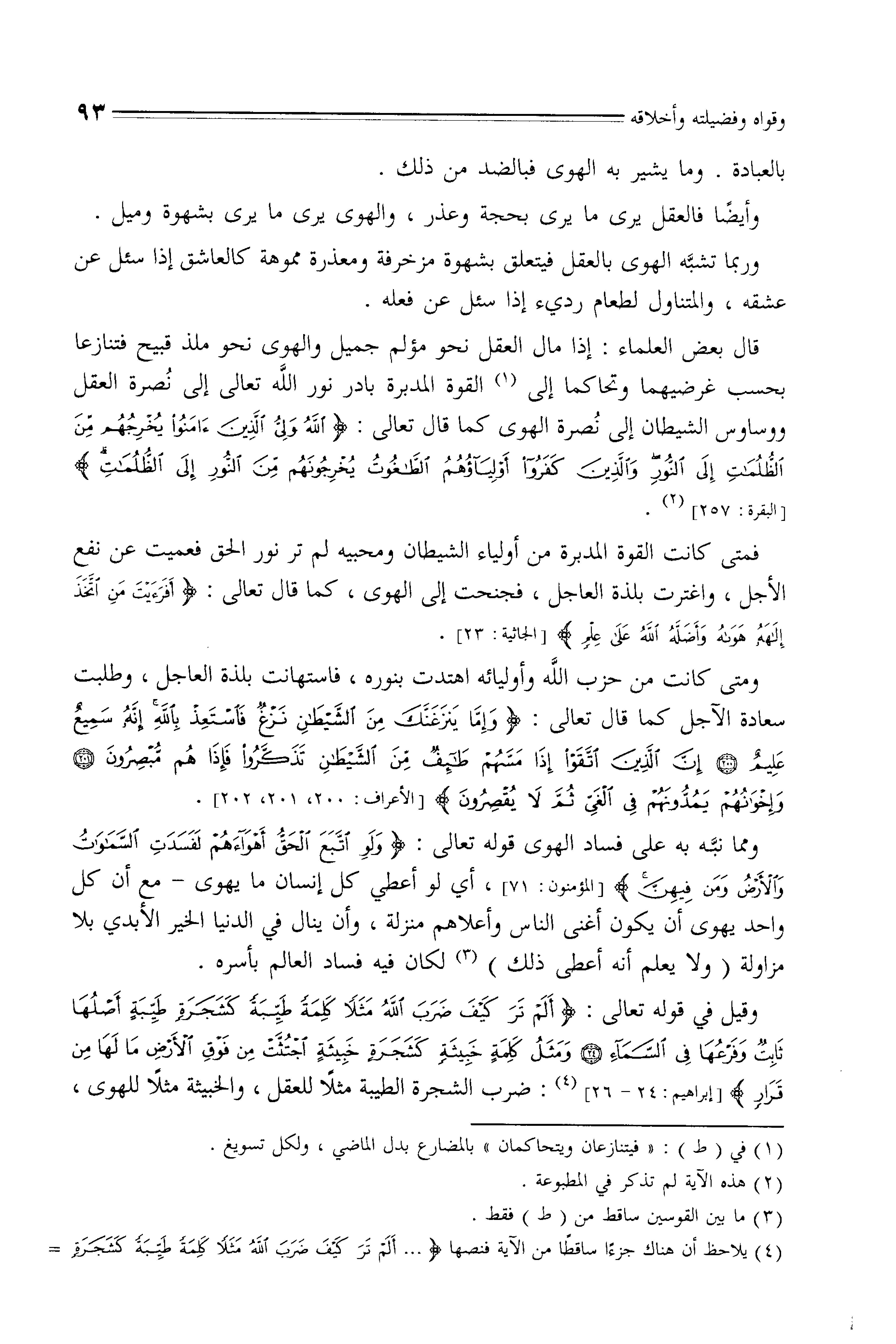 ومتى كانت من حزب اللَّه وأوليائه اهتدت بنوره، فاستهانت بلذة العاجل، وطلبت سعادة الآجل كما قال تعالى: (وَإِمَّا يَنْزَغَنَّكَ مِنَ الشَّيْطَانِ نَزْغٌ فَاسْتَعِذْ بِاللَّهِ إِنَّهُ سَمِيعٌ عَلِيمٌ (200) إِنَّ الَّذِينَ اتَّقَوْا إِذَا مَسَّهُمْ طَائِفٌ مِنَ الشَّيْطَانِ تَذَكَّرُوا فَإِذَا هُمْ مُبْصِرُونَ (201) وَإِخْوَانُهُمْ يَمُدُّونَهُمْ فِي الْغَيِّ ثُمَّ لَا يُقْصِرُونَ (202) .