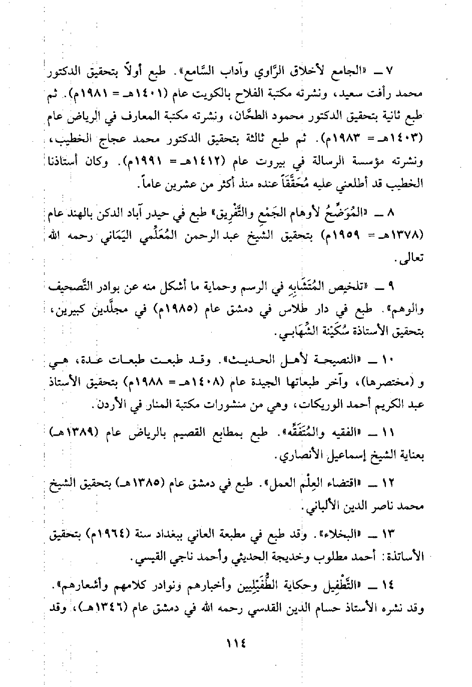 ٧ - "الجامع لأخلاق الرَّاوي وآداب السَّامع". طبع أولًا بتحقيق الدكتور محمد رأفت سعيد، ونشرته مكتبة الفلاح بالكويت عام (١٤٠١ هـ = ١٩٨١ م). ثم طبع ثانية بتحقيق الدكتور محمود الطحَّان، ونشرته مكتبة المعارف في الرياض عام (١٤٠٣ هـ = ١٩٨٣ م). ثم طبع ثالثة بتحقيق الدكتور محمد عجاج الخطيب، ونشرته مؤسسة الرسالة في بيروت عام (١٤١٢ هـ = ١٩٩١ م). وكان أستاذنا الخطيب قد أطلعني عليه مُحَقَّقًا عنده منذ أكثر من عشرين عامًا.