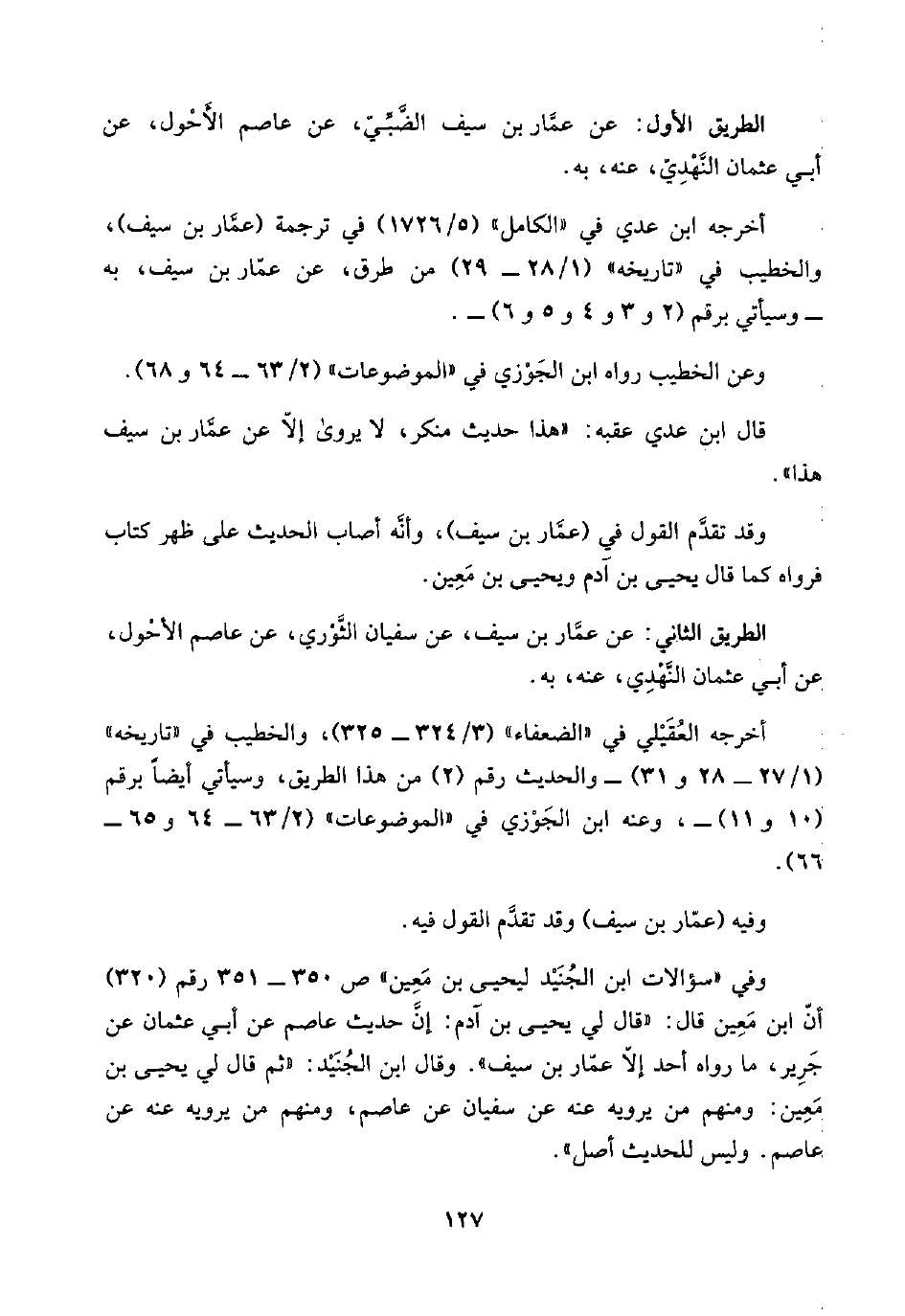 وفي "سؤالات ابن الجُنَيْد ليحيى بن مَعِين" ص ٣٥٠ - ٣٥١ رقم (٣٢٠) أنّ ابن مَعِين قال: "قال لي يحيى بن آدم: إنَّ حديث عاصم عن أبي عثمان عن جَريِر، ما رواه أحد إلا عمّار بن سيف". وقال ابن الجُنَيْد: "ثم قال لي يحيى بن مَعِين: ومنهم من يرويه عنه عن سفيان عن عاصم، ومنهم من يرويه عنه عن عاصم. وليس للحديث أصله".