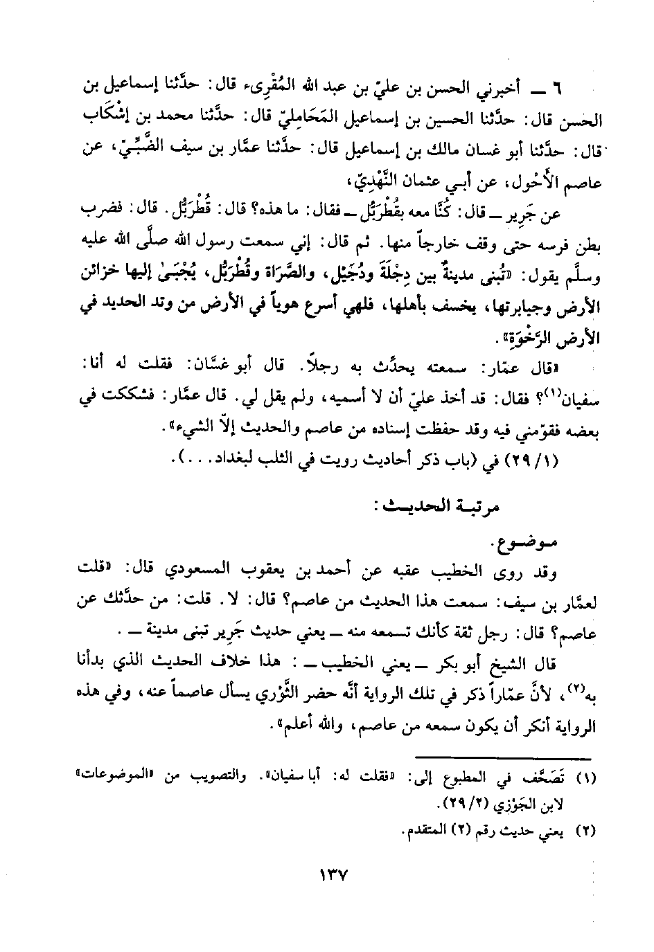 ٦ - أخبرني الحسن بن عليّ بن عبد اللَّه المُقْرِئ قال: حدَّثنا إسماعيل بن الحسن قال: حدَّثنا الحسين بن إسماعيل المَحَامِليّ قال: حدَّثنا محمد بن إشْكَاب قال: حدَّثنا أبو غسان مالك بن إسماعيل قال: حدَّثنا عمَّار بن سيف الضَّبِّيّ، عن عاصم الأَحْول، عن أبي عثمان النَّهْدِيّ،