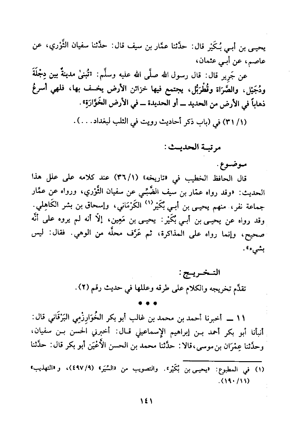 قال الحافظ الخطيب في تاريخه (١/ ٣٦) عند كلامه على علل هذا الحديث: "وقد رواه عمَّار بن سيف الضَّبِّي عن سفيان الثَّوْري، ورواه عن عمَّار جماعة نفر، منهم يحيى بن أبي بُكَيْر (¬١) الكَرْمَاني، وإسحاق بن بشر الكَاهِلي. وقد رواه عن يحيى بن أبي بُكَيْر: يحيى بن مَعِين، إلّا أنه لم يروه على أنَّه صحيح، وإنما رواه على المذاكرة، ثم عَرَّف محلَّه من الوهي. فقال: ليس بشيء".