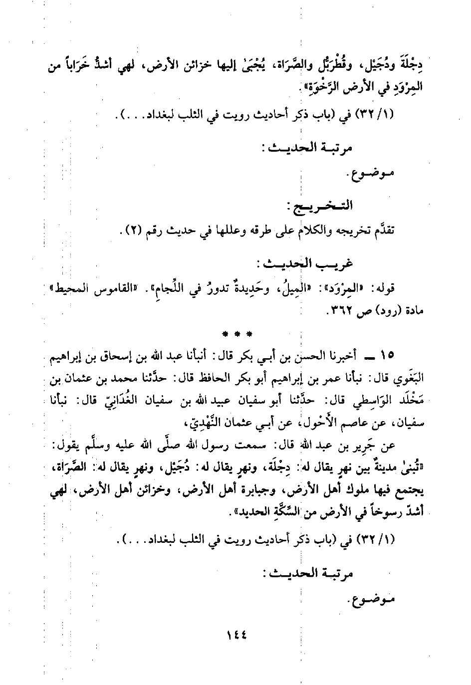 (١/ ٣٢) في (باب ذكر أحاديث رويت في الثلب لبغداد. . .).