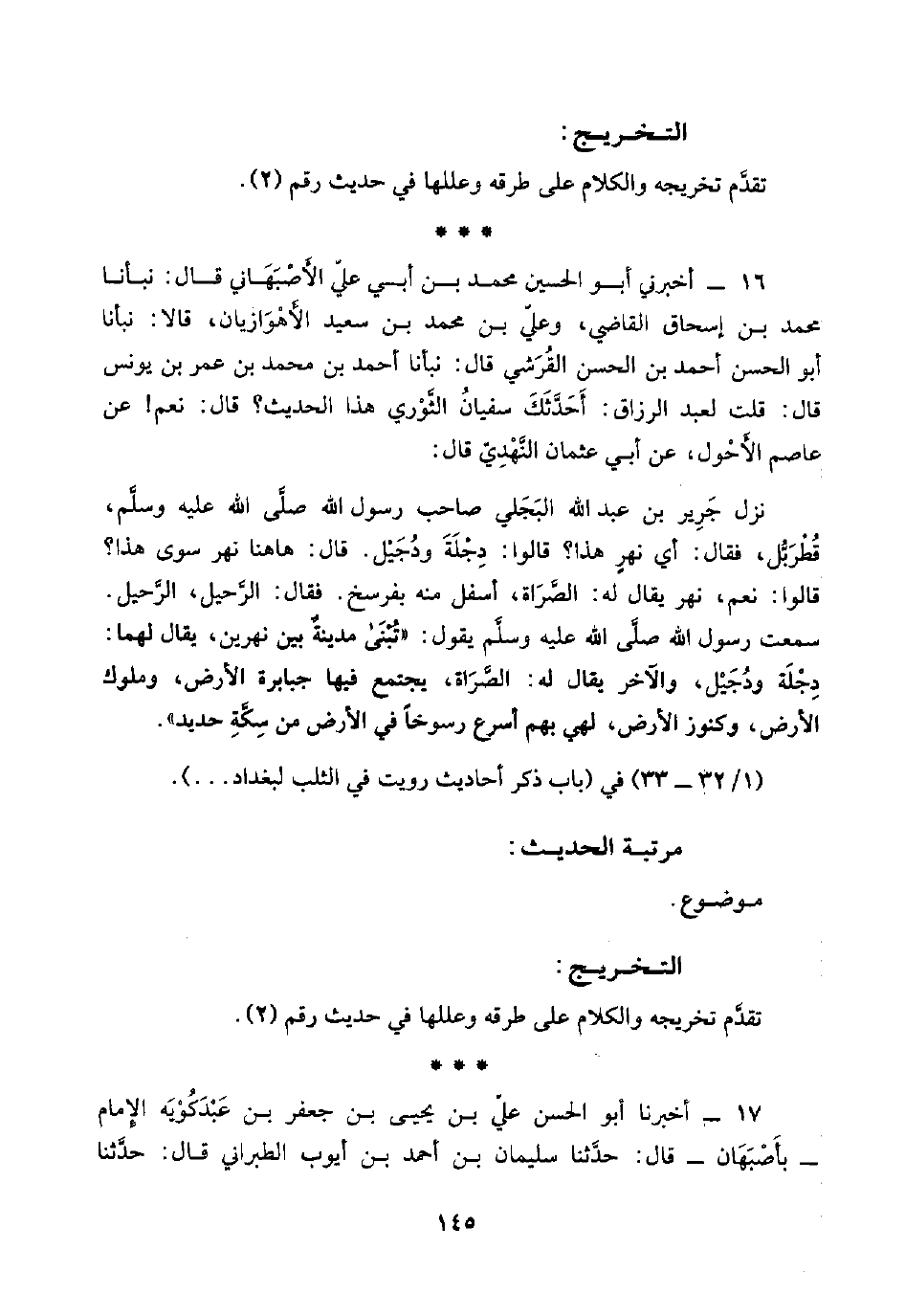 (١/ ٣٢ - ٣٣) في (باب ذكر أحاديث رويت في الثلب لبغداد. . .).