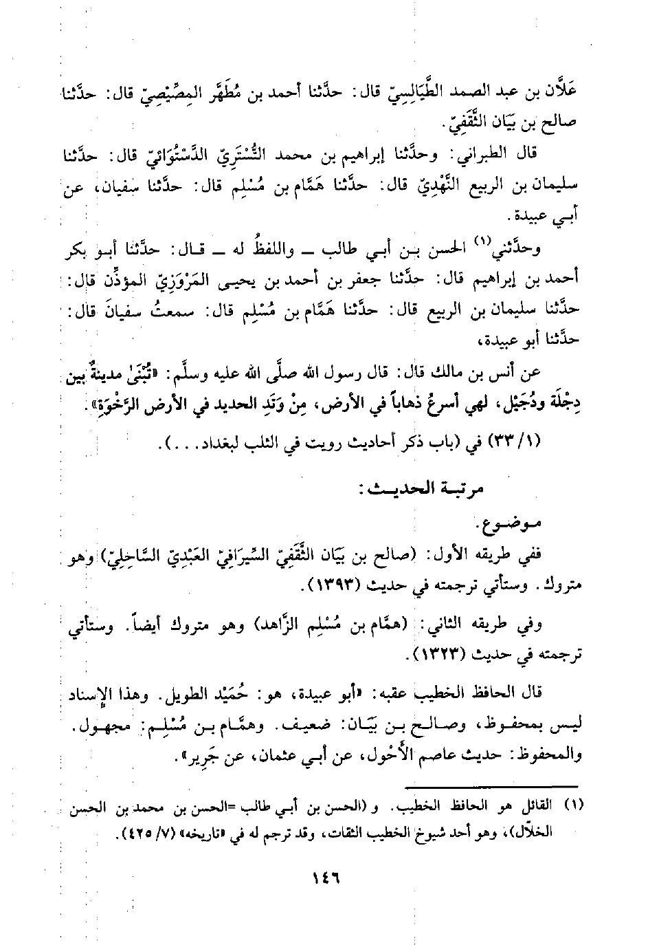 قال الحافظ الخطيب عقبه: "أبو عبيدة، هو: حُمَيْد الطويل. وهذا الإِسناد ليس بمحفوظ، وصالح بن بَيَان: ضعيف. وهمَّام بن مُسْلِم: مجهول. والمحفوظ: حديث عاصم الأَحْول، عن أبي عثمان، عن جَرِير".