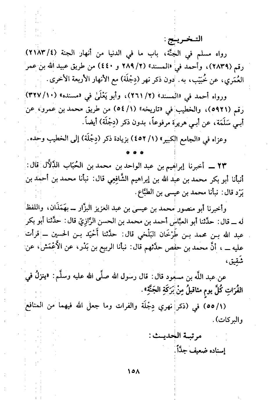 رواه مسلم في الجنَّة، باب ما في الدنيا من أنهار الجنة (٤/ ٢١٨٣) رقم (٢٨٣٩)، وأحمد في "المسند" (٢/ ٢٨٩ و ٤٤٠) من طريق عبيد اللَّه بن عمر العُمَري، عن خُبَيْب، به. دون ذكر نهر (دِجْلَة) مع الأنهار الأربعة الأخرى.