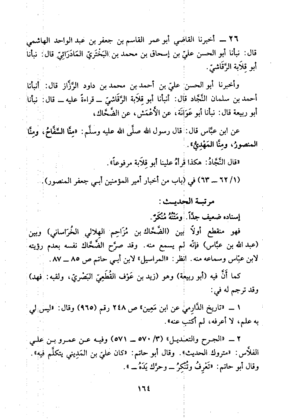 عن ابن عبَّاس قال: قال رسول اللَّه صلَّى اللَّه عليه وسلَّم: "مِنَّا السَّفَّاحُ، ومِنَّا المنصورُ، ومِنَّا المَهْدِيُّ".