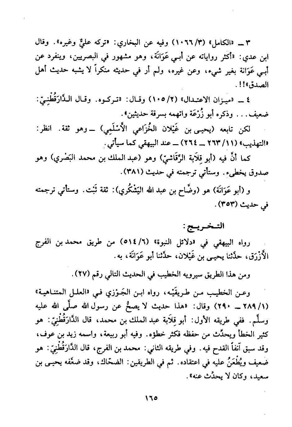 ٣ - "الكامل" (٣/ ١٠٦٦) وفيه عن البخاري: "تركه عليٌّ وغيره". وقال ابن عدي: "أكثر رواياته عن أبي عَوَانَة، وهو مشهور في البصريين، وينفرد عن أبي عَوَانة بغير شيء، وعن غيره، ولم أر في حديثه منكرًا لا يشبه حديث أهل الصدق"! ! .