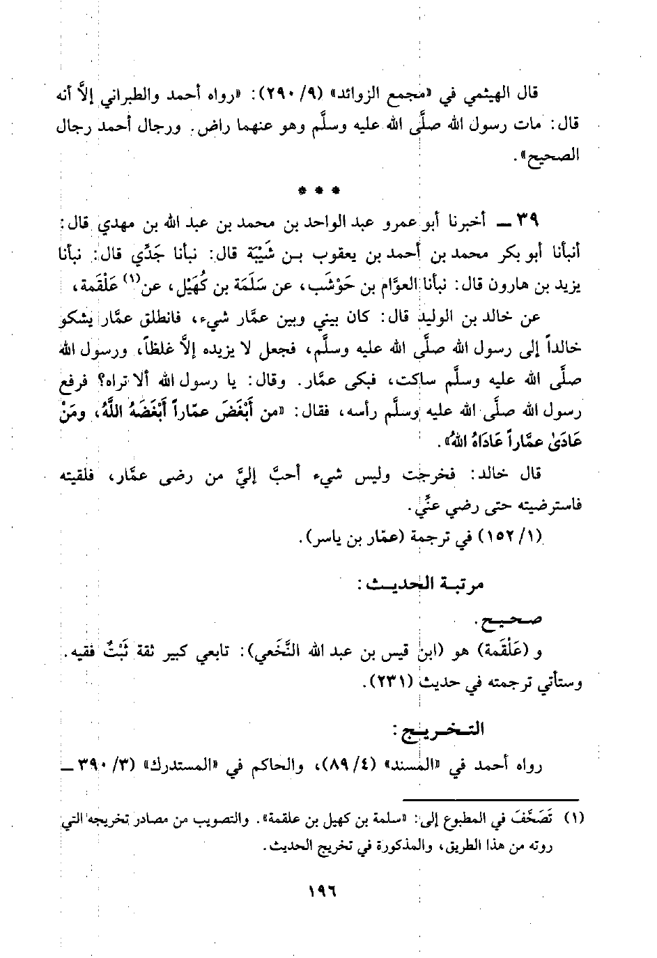 ٣٩ - أخبرنا أبو عمرو عبد الواحد بن محمد بن عبد اللَّه بن مهدي قال: أنبأنا أبو بكر محمد بن أحمد بن يعقوب بن شَيْبَة قال: نبأنا جَدِّي قال: نبأنا يزيد بن هارون قال: نبأنا: العوَّام بن حَوْشَب، عن سَلَمَة بن كُهَيْل، عن (¬١) عَلْقَمة،