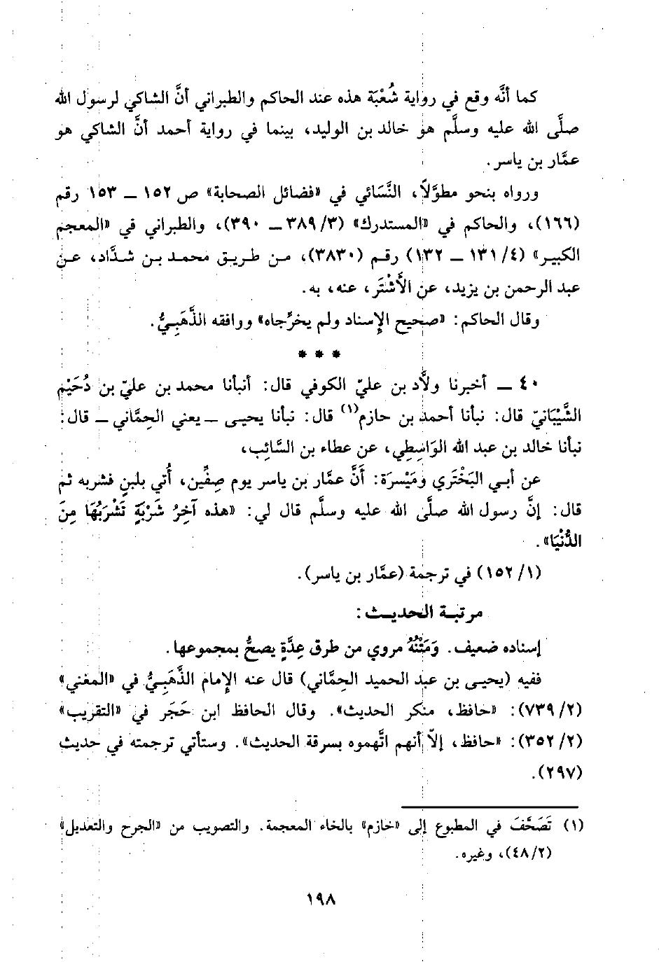 ٤٠ - أخبرنا ولَّاد بن عليّ الكوفي قال: أنبأنا محمد بن عليّ بن دُحَيْم الشَّيْبَانيّ قال: نبأنا أحمد بن حازم (¬١) قال: نبأنا يحيى -يعني الحِمَّاني- قال: نبأنا خالد بن عبد اللَّه الوَاسِطِي، عن عطاء بن السَّائِب،