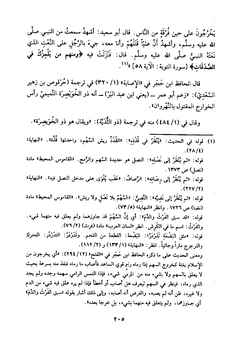 قال الحافظ ابن حجر في "الإِصابة" (١/ ٣٢٠) في ترجمة (حُرْقوص بن زهير السَّعْدِيّ): "زعم أبو عمر - (يعني ابن عبد البَرّ) - أنه ذو الخُوَيْصِرَة التَّميميّ رأس الخوارج المقتول بالنَّهْروان".