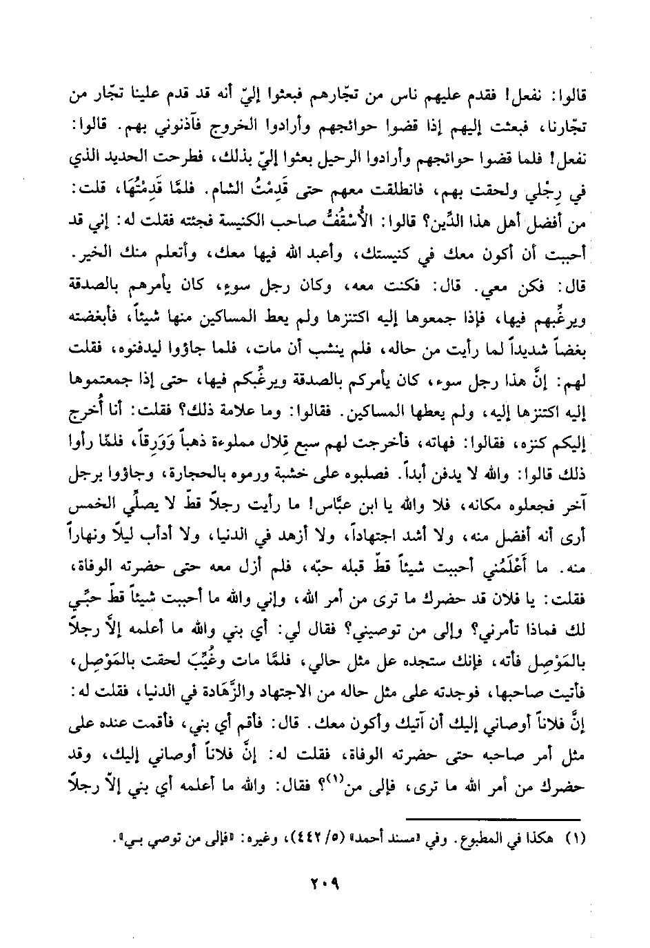 قالوا: نفعل! فقدم عليهم ناس من تجّارهم فبعثوا إليّ أنه قد قدم علينا تجّار من تجّارنا، فبعثت إليهم إذا قضوا حوائجهم وأرادوا الخروج فآذنوني بهم. قالوا: نفعل! فلما قضوا حوائجهم وأرادوا الرحيل بعثوا إليّ بذلك، فطرحت الحديد الذي في رِجْلي ولحقت بهم، فانطلقت معهم حتى قُدِمْتُ الشام. فلمَّا قَدِمْتُهَا، قلت: من أفضل أهل هذا الدِّين؟ قالوا: الأُسْقُفُّ صاحب الكنيسة فجئته فقلت له: إني قد أحببت أن أكون معك في كنيستك، وأعبد اللَّه فيها معك، وأتعلم منك الخير. قال: فكن معي. قال: فكنت معه، وكان رجل سوءٍ، كان يأمرهم بالصدقة ويرغِّبهم فيها، فإذا جمعوها إليه اكتنزها ولم يعط المساكين منها شيئًا، فأبغضته بغضًا شديدًا لما رأيت من حاله، فلم ينشب أن مات، فلما جاؤوا ليدفنوه، فقلت لهم: إنَّ هذا رجل سوء، كان يأمركم بالصدقة ويرغِّبكم فيها، حتى إذا جمعتموها إليه اكتنزها إليه، ولم يعطها المساكين. فقالوا: وما علامة ذلك؟ فقلت: أنا أُخرج إليكم كنزه، فقالوا: فهاته، فأخرجت لهم سبع قِلال مملوءة ذهبًا وَوَرِقًا، فلمّا رأوا ذلك قالوا: واللَّه لا يدفن أبدًا. فصلبوه على خشبة ورموه بالحجارة، وجاؤوا برجل آخر فجعلوه مكانه، فلا واللَّه يا ابن عبَّاس! ما رأيت رجلًا قطّ لا يصلِّي الخمس أرى أنه أفضل منه، ولا أشد اجتهادًا، ولا أزهد في الدنيا، ولا أدأب ليلًا ونهارًا منه. ما أَعْلَمُني أحببت شيئًا قطّ قبله حبّه، فلم أزل معه حتى حضرته الوفاة، فقلت: يا فلان قد حضرك ما ترى من أمر اللَّه، وإني واللَّه ما أحببت شيئًا قطّ حبِّي لك فماذا تأمرني؟ وإلى من توصيني؟ فقال لي: أي بني واللَّه ما أعلمه إلَّا رجلًا بالمَوْصِل فأته، فإنك ستجده عل مثل حالي، فلمَّا مات وغُيِّبَ لحقت بالمَوْصِل، فأتيت صاحبها، فوجدته على مثل حاله من الاجتهاد والزَّهَادة في الدنيا، فقلت له: إنَّ فلانًا أوصاني إليك أن آتيك وأكون معك. قال: فأقم أي بني، فأقمت عنده على مثل أمر صاحبه حتى حضرته الوفاة، فقلت له: إنَّ فلانًا أوصاني إليك، وقد حضرك من أمر اللَّه ما ترى، فإلى من (¬١)؟ فقال: واللَّه ما أعلمه أي بني إلّا رجلًا