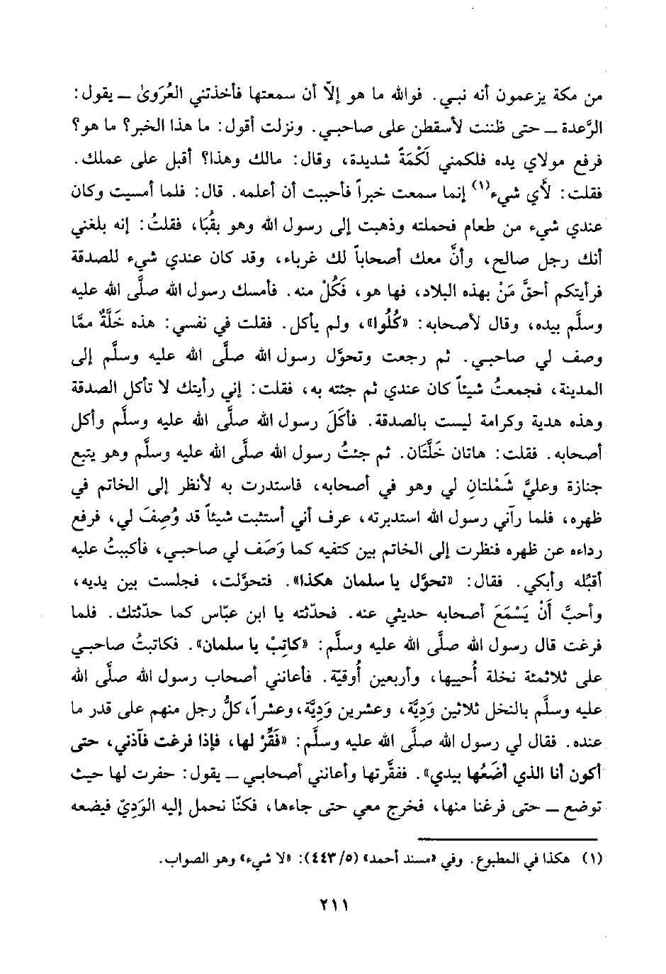 من مكة يزعمون أنه نبي. فواللَّه ما هو إلّا أن سمعتها فأخذتني العُرَوى -يقول: الرَّعدة- حتَّى ظننت أسقطن على صاحبي. ونزلت أقول: ما هذا الخبر؟ ما هو؟ فرفع مولاي يده فلكمني لَكْمَةً شديدة، وقال: مالك وهذا؟ أقبل على عملك. فقلت: لأَي شيء (¬١) إنما سمعت خبرًا فأحببت أن أعلمه. قال: فلما أمسيت وكان عندي شيء من طعام فحملته وذهبت إلى رسول اللَّه وهو بقُبَا، فقلتُ: إنه بلغني أنك رجل صالح، وأنَّ معك أصحابًا لك غرباء، وقد كان عندي شيء للصدقة فرأيتكم أحقَّ مَنْ بهذه البلاد، فها هو، فَكُلْ منه. فأمسك رسول اللَّه صلَّى اللَّه عليه وسلَّم بيده، وقال لأصحابه: "كُلُوا"، ولم يأكل. فقلت في نفسي: هذه خَلَّةٌ ممَّا وصف لي صاحبي. ثم رجعت وتحوَّل رسول اللَّه صلَّى اللَّه عليه وسلَّم إلى المدينة، فجمع شيئًا كان عندي ثم جئته به، فقلت: إني رأيتك لا تأكل الصدقة وهذه هدية وكرامة ليست بالصدقة. فأكَلَ رسول اللَّه صلَّى اللَّه عليه وسلَّم وأكل أصحابه. فقلت: هاتان خَلَّتَان. ثم جئتُ رسول اللَّه صلَّى اللَّه عليه وسلَّم وهو يتبع جنازة وعليَّ شَمْلتانِ لي وهو في أصحابه، فاستدرت به لأنظر إلى الخاتم في ظهره، فلما رآني رسول اللَّه استدبرته، عرف أني أستثبت شيئًا قد وُصِفَ لي، فرفع رداءه عن ظهره فنظرت إلى الخاتم بين كتفيه كما وَصَف لي صاحبي، فأكببتُ عليه أقبِّله وأبكي. فقال: "تحوَّل يا سلمان هكذا". فتحوَّلت، فجلست بين يديه، وأحبَّ أَنْ يَسْمَعَ أصحابه حديثي عنه. فحدّثته يا ابن عبَّاس كما حدّثتك. فلما فرغت قال رسول اللَّه صلَّى اللَّه عليه وسلَّم: "كاتِبْ يا سلمان". فكاتبُ صاحبي على ثلاثمئة نخلة أُحييها، وأربعين أُوقيّة. فأعانني أصحاب رسول اللَّه صلَّى اللَّه عليه وسلَّم بالنخل ثلاثين وَدِيَّة، وعشرين وَدِيَّة، وعشرًا، كلُّ رجل منهم على قدر ما عنده. فقال لي رسول اللَّه صلَّى اللَّه عليه وسلَّم: "فَقِّرْ لها، فإذا فرغت فآذني، حتَّى أكون أنا الَّذي أضَعُها بيدي". ففقَّرتها وأعانني أصحابي -يقول: حفرت لها حيث توضع- حتى فرغنا منها، فخرج معي حتى جاءها، فكنّا نحمل إليه الوَدِيّ فيضعه