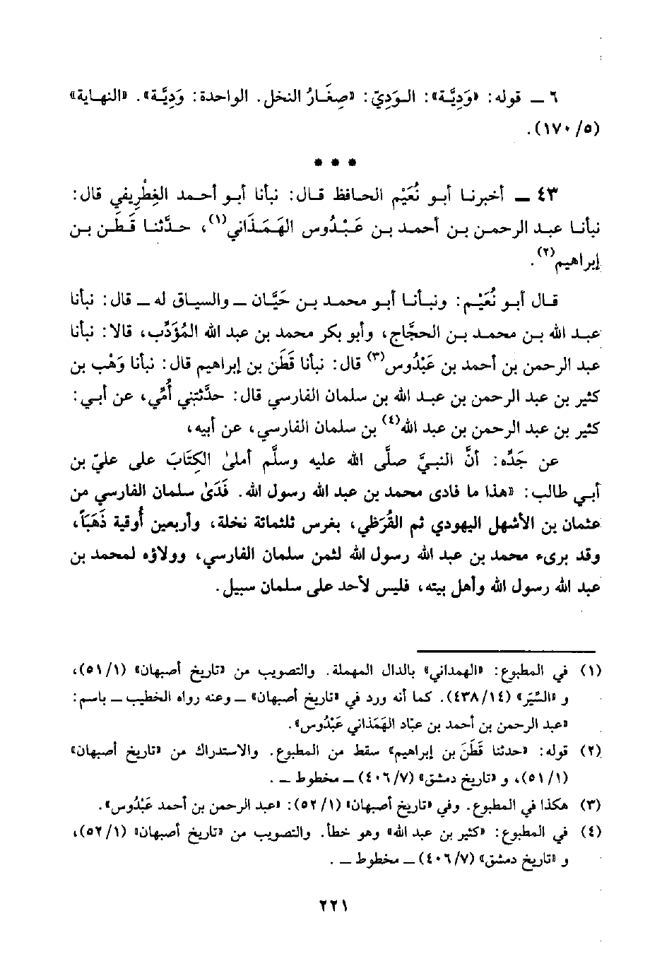 قال أبو نُعَيْم: ونبأنا أبو محمد بن حَيَّان -والسياق له- قال: نبأنا عبد اللَّه بن محمد بن الحجَّاج، وأبو بكر محمد بن عبد اللَّه المُؤَدِّب، قالا: نبأنا عبد الرحمن بن أحمد بن عَبْدُوس (¬٣) قال: نبأنا قَطَن بن إبراهيم قال: نبأنا وَهْب بن كثير بن عبد الرحمن بن عبد اللَّه بن سلمان الفارسي قال: حدَّثتني أُمِّي، عن أبي: كثير بن عبد الرحمن بن عبد اللَّه (¬٤) بن سلمان الفارسي، عن أبيه،