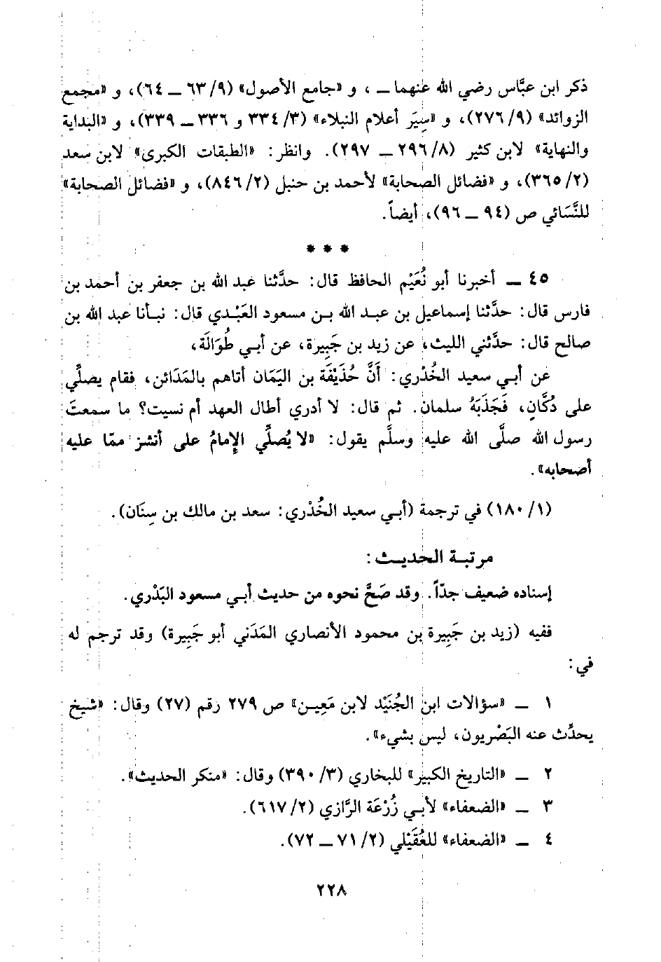 ٤٥ - أخبرنا أبو نُعَيْم الحافظ قال: حدَّثنا عبد اللَّه بن جعفر بن أحمد بن فارس قال: حدَّثنا إسماعيل بن عبد اللَّه بن مسعود العَبْدي قال: نبأنا عبد اللَّه بن صالح قال: حدَّثني الليث، عن زيد بن جَبِيرة، عن أبي طُوَالَة،